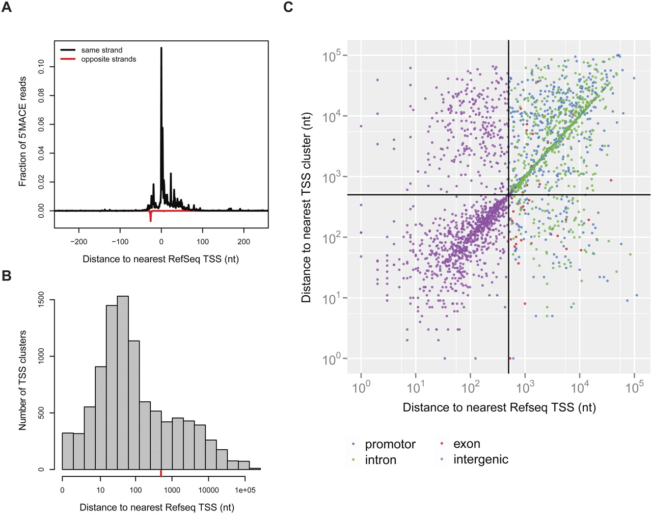 PcG proteins bind nonannotated TSSs. (A) 5′-MACE detects annotated transcription starts shown by metagene analysis of the read distribution. (B) 5′-MACE detects a TSS cluster far from known promoter regions. The red line marks a distance of ±500 bp. (C) PcG binding sites in S2 cells scattered according to their distance to the RefSeq TSS and TSS cluster found by 5′-MACE. The crosshair marks a distance of ±500 bp, and the newly identified PcG-bound promoter can be found in the lower right quarter.