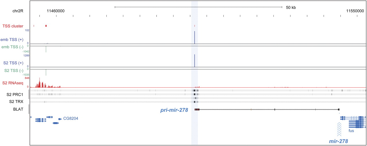 Intergenic PcG binding site acts as promoter for a pri-miRNA. Screenshot from the UCSC Genome Browser including data from ChIP-seq, RNA-seq, and 5′-MACE detecting TSS clusters. The pri-mir-278 transcript (BLAT alignment, black) emanates from a PcG-bound promoter located over 40 kb upstream of the mature miRNA.