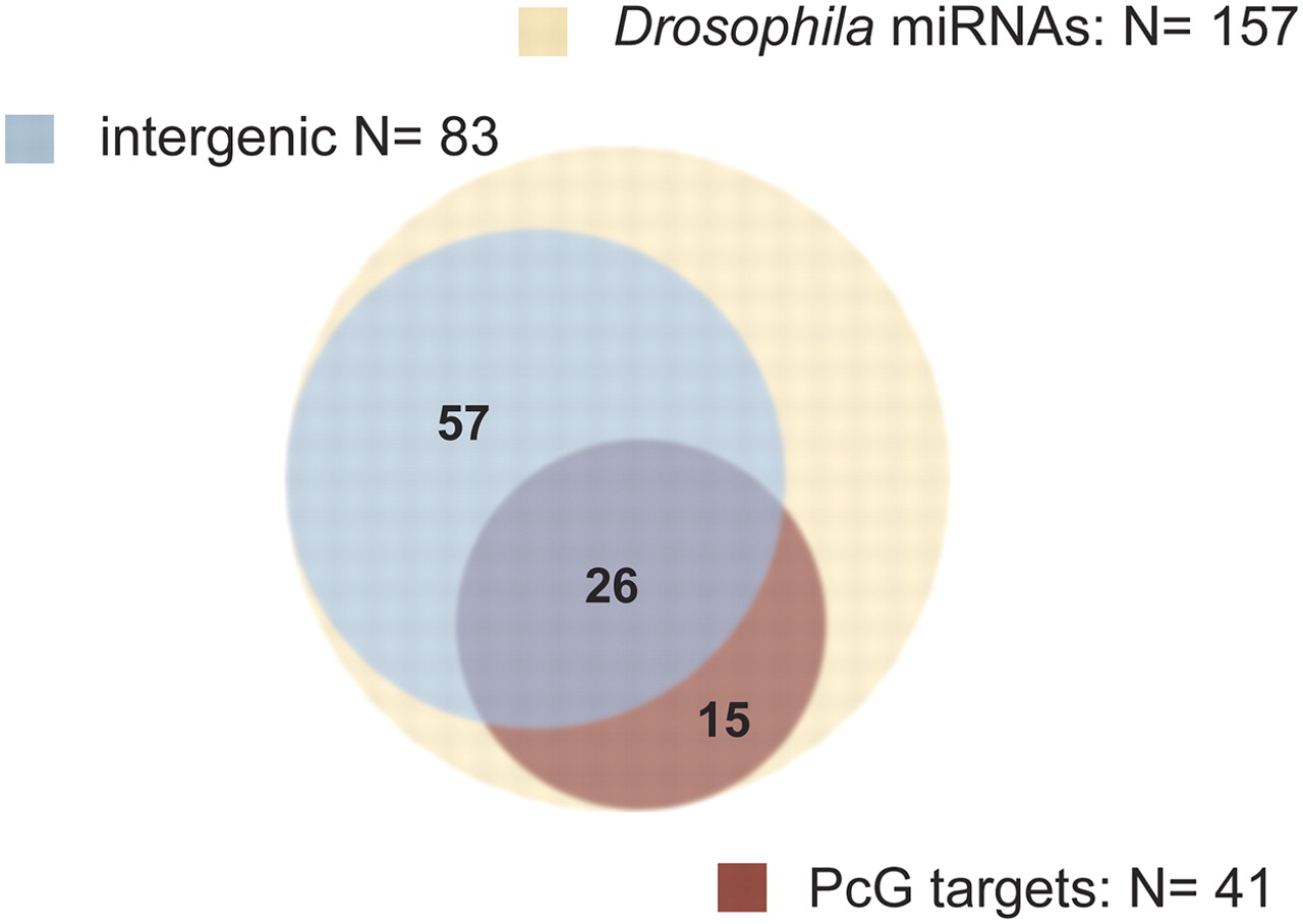 PcG proteins bind the promoter of primary miRNA transcripts. Venn diagram showing 41 Drosophila miRNAs that qualify as PcG targets (see Methods), including many loci lacking information about the primary transcription unit.