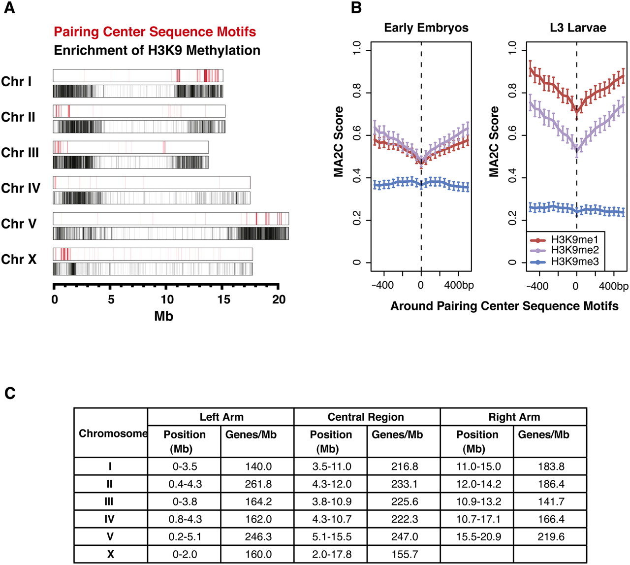 H3K9 methylation is enriched on chromosome arms, especially the arms with the pairing center. (A, red lines) Meiotic pairing center motif coordinates, obtained from a motif scan analysis (Phillips et al. 2009). On autosomes, >90% of these motifs lie within the pairing center regions, as do ∼65% of those on the X chromosome. (Below, black lines) Regions enriched in H3K9 methylation. (B) Average H3K9me1/2/3 signals around all pairing center motifs are shown in early embryo (EE) and L3 larvae (L3). (C) Approximate coordinates of chromosome arms and central regions as determined from enrichment of H3K9 methylation. The boundaries between chromosome arms and centers were determined by visual inspection, as the approximate midpoint of the transition region from high to low H3K9me enrichment (Supplemental Fig. S4).