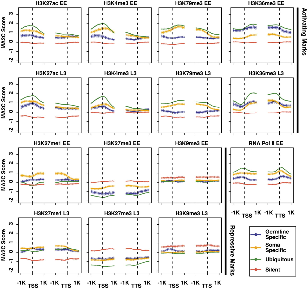 Profiles of factors on genes with different spatial–temporal expression. Average signal profiles in the 2 kb around transcript start sites (TSS) and transcript termination sites (TTS) are shown for selected factors on four categories of genes: ubiquitously expressed genes, silent genes (genes encoding serpentine receptors), genes expressed specifically in somatic tissues, and genes expressed specifically in the maternal adult germline. The top two rows are marks associated with active gene expression; the bottom two rows are marks associated with repression.