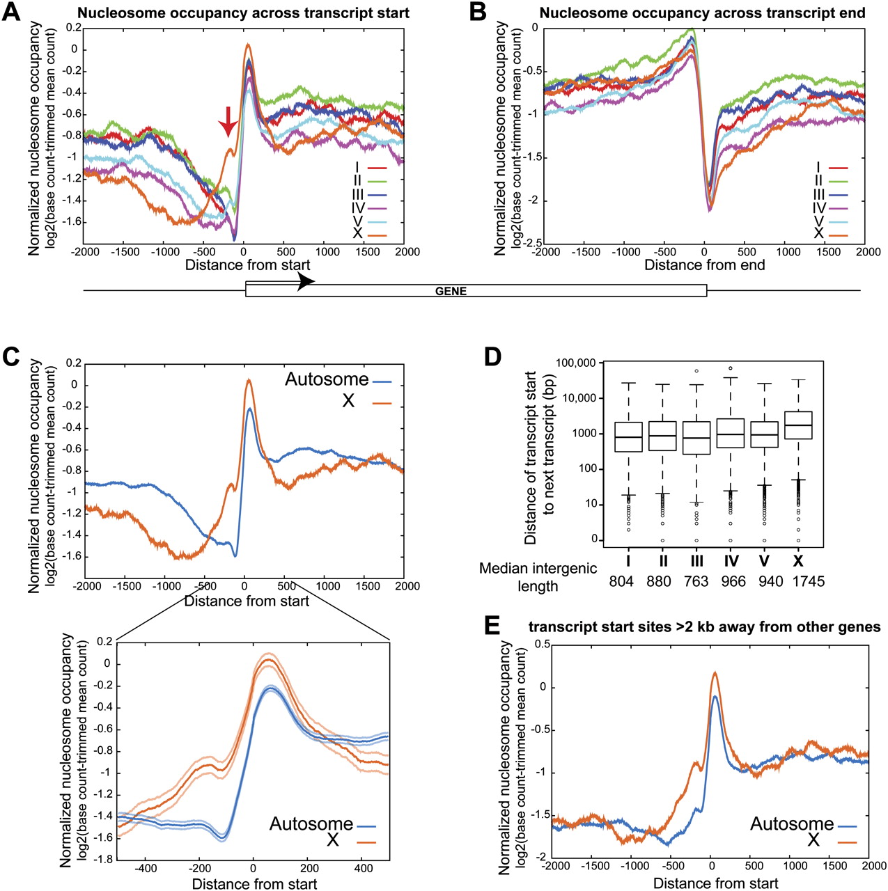 Higher nucleosome occupancy on X promoters. Normalized embryo nucleosome occupancy per base pair was averaged across all transcripts, and plotted across the transcript start (A) and end (B) for each chromosome. A schematic representation of a gene is shown below the panels, and the red arrow in panel A indicates the higher nucleosome occupancy on the X promoters. (C) The same as A, but the data from autosomes are collapsed. The lower panel zooms to the 1-kb region around the transcript start. The lighter shades of each line represent two standard errors from the mean. (D) The distance between each transcript start to the nearest upstream transcript is plotted for each chromosome. Median length is reported below. (E) Same as A, but for only genes whose transcript starts are more than 2 kb away from other genes are used. This consisted of 5084 autosomal and 1480 X chromosome transcripts.
