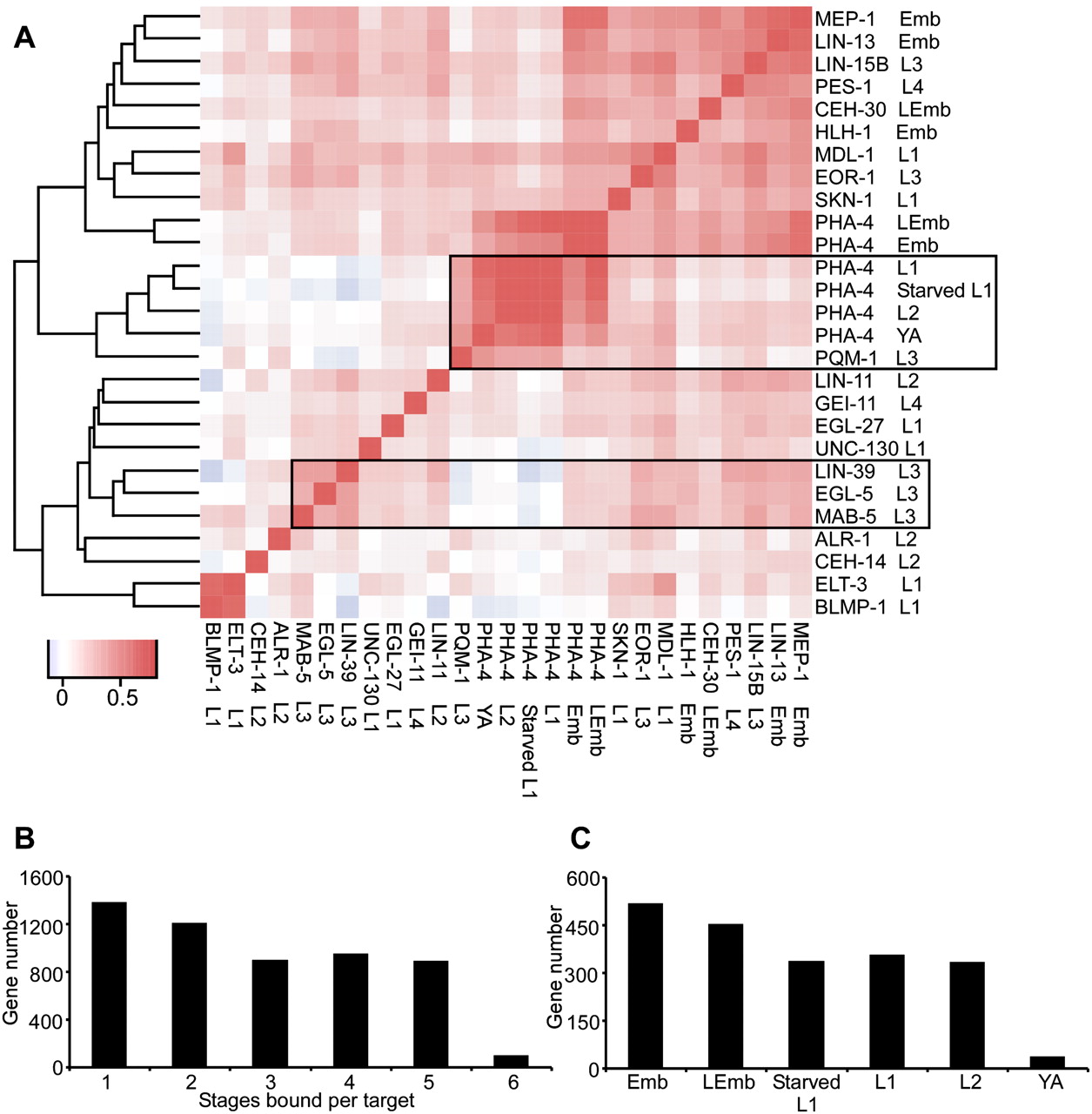 Correlation of target gene binding by the 22 TFs. (A) Peak regions of all 22 factors (without HOT sites) were collected and binned into 100-bp windows. The signal in each bin for each factor was used in pairwise correlations as shown in the heat map. The heat map reflects the co-bound frequency (correlation coefficient) of each pair of TFs, with red indicating more co-bound regions and blue indicating less. TFs have been clustered along both axes based on similarity in their bound regions. (B) A histogram showing the number of genes targeted by PHA-4 at one, two, or more stages of development. (C) A histogram showing the number of unique PHA-4 binding sites at each stage.