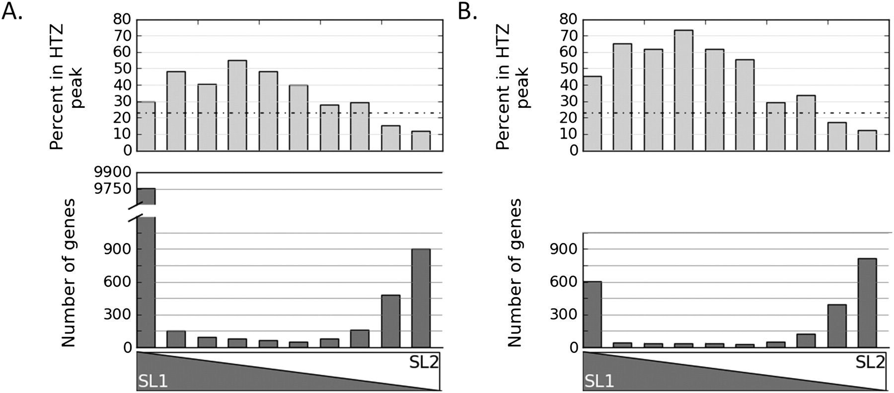 Relationship between trans-splicing specificity and proximal promoters. (Bottom) Histogram of the total number of genes with indicated SL1/SL2 proportion. (Top) The percent of those genes associated with a peak of the minor histone HTZ, which marks promoters (Whittle et al. 2008). (A) Genes with low percent SL2 (high SL1) are more likely to be in an HTZ peak than genes with high SL2. Trans-splices sites with mixed SL are the category most likely to be in an HTZ peak. (B) When genes with <500-bp intercistronic distance are analyzed, those with high SL1 are even more likely to be in an HTZ peak. Dotted line indicates the percent of all genes with an HTZ peak (Whittle et al. 2008).