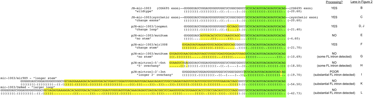 Constructs used for structural analysis of mirtron biogenesis. Shown are sequence variants of the mir-1003 mirtron used for functional tests. (Green) The mature miRNA sequence; (yellow) the nucleotides differing from mir-1003. Their relative abilities to be processed in S2 cells are indicated (see also Fig. 2).