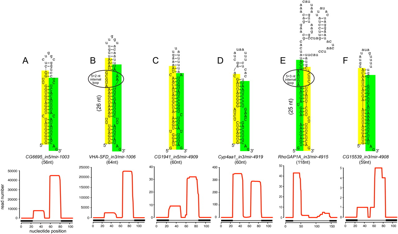 Examples of known and novel mirtrons in D. melanogaster. The abundant small RNAs derived from each hairpin are highlighted, green for the miRNA and yellow for the miRNA*. Below the secondary structures are plots that show the abundance of cloned small RNAs across the aggregate D. melanogaster small RNA data. The small RNA density is highest at either end of each intron, with typically one side accumulating to a higher level; often this is the 3′ arm, but occasionally it is the 5′ arm. The black boxes below the graph indicate the exon–intron boundaries. (A) CG6695_in5/mir-1003 is an example of a conserved, abundantly expressed mirtron with optimal features, including a straight short intronic hairpin with a 2-nt 3′ overhang. (B) Vha-SFD_in3/mir-1006 is an example of a conserved, abundant-expressed mirtron with a large asymmetric internal loop (5 + 2 nt). CG1941_in5 (C) and Cyp4aa1_in3 (D) are novel mirtrons with typical straight hairpins and compatible overhangs. (E) RhoGAP1A_in3 is an expressed mirtron with an unusually large, unstructured terminal loop, a large asymmetric internal loop (5 + 3 nt) and single nucleotide overhangs at its 5′ and 3′ ends. (F) CG15539_in3 exhibits convincing mirtron features, but is on the borderline of confident cloning evidence; nevertheless, its reads exhibit a characteristic 2-nt 3′ overhang on the Dicer-1-cleaved end.