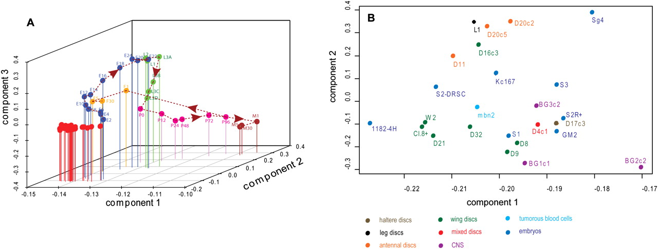 Clustering of cell lines by principal component analysis. (A) Clustering of cell lines with whole-animal developmental stages, showing components 1, 2, and 3. The whole-animal data were obtained using the same procedures as the cell line data (Graveley et al. 2011). (Red) Cell lines. (Dotted line) A trajectory for the developmental data. (Blue) Embryonic stages (Ex, where x is the time, in hours, at the end of a 2-h period measured from egg-laying); (green) larval stages (Lx where x is the instar number; 3A, 3B, 3C, and 3D represent sequential periods in the third larval instar); (pink) pupal stages (Px, where x is the time, in hours, after white prepupa); (brown) adult males (Mx, where x is the time, in days, after adult eclosion); (yellow) adult females (Fx, where x is the time, in days, after adult eclosion). (B) Clustering of 25 cell lines; components 1 and 2 are shown. Cell lines are color-coded to indicate the tissues from which they were derived; a key is shown below the graph.