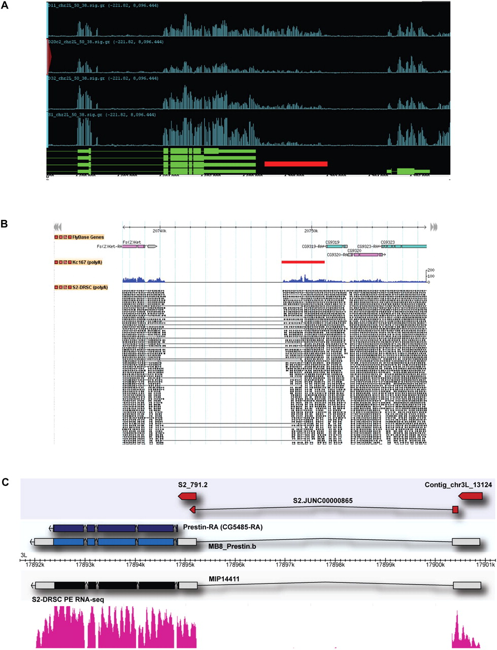 Examples of new UTRs revealed by novel contigs. (A) Novel contig whose expression is correlated with that of chinmo. The region illustrated includes the 3′ portion of the annotated chinmo gene and all of its downstream neighbor, cpb. Signal graphs for the transcripts are shown for eight cell lines. (Red bar) The position of the novel contig; a region of continuously overlapping paired-end sequences (blue line) connects the novel contig to chinmo. (B) Novel contig that appears to encode a novel 3′ exon for Fs(2)Ket. The display is similar to panel A, showing the convergently transcribed genes Fs(2)Ket and CG9310. Much of the region between the two genes is covered by a transposable element and is therefore masked from both tiling array and RNA-seq analysis. However, paired-end RNA-seq showed multiple clones in all four of the lines that were analyzed in which one end lies in the 3′ region of the annotated Fs(2)Ket transcript and the other end lies in the novel contig 7 kb away; the dashed blue line indicates the region that is bridged by these clones. The novel contig also contains overlapping paired-end clones that extend into the annotated CG9310 transcript. These data indicate that the contig probably corresponds to novel overlapping 3′ regions from the two genes. (C) A contig that corresponds to a novel 5′ exon for Prestin, a gene for which only the coding region was previously annotated. (From top to bottom) The novel contig (red bar); a novel splice junction identified from RNA-seq data from S2-DRSC RNA; the FlyBase v5.12 annotation for Prestin, which includes only the coding region (purple); a Prestin transcript from the unpublished annotation MB8 (MJ van Baren, L Langton, CL Comstock, BC Koebbe, and MR Brent, unpubl.; http://www.modencode.org/), which used the RNA-seq splicing data as input for the annotation (blue and white); sequence of a full-length cDNA clone MIP14411 (GenBank accession no. BT120083) retrieved by targeting with the FB 5.12 gene model; and pattern of transcripts from RNA-seq analysis of S2-DRSC cells.