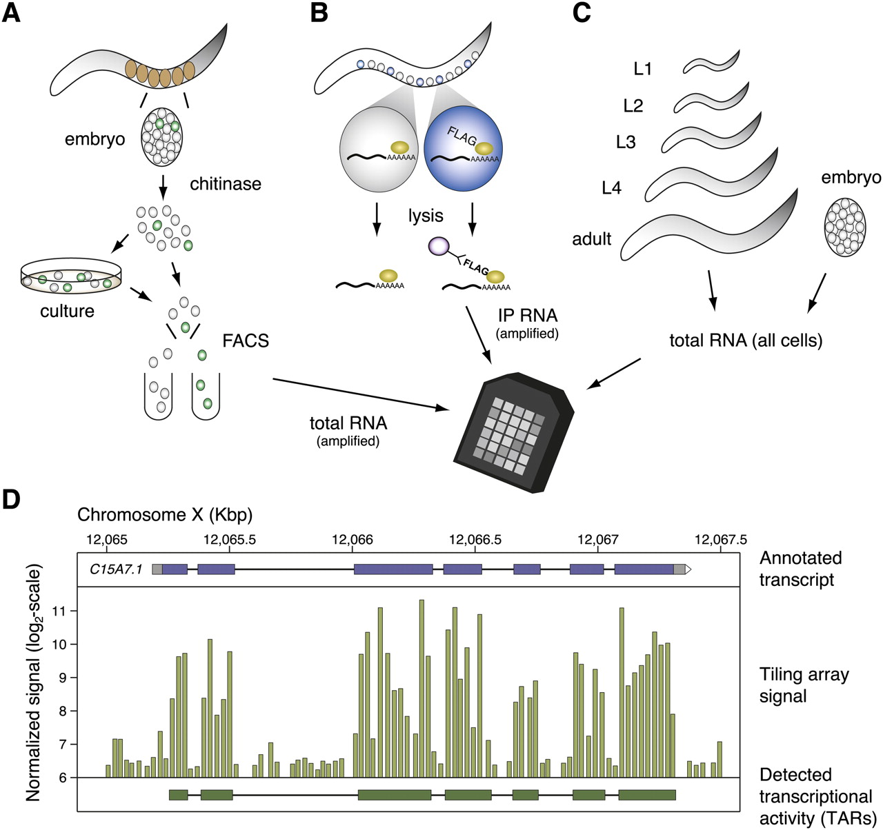 Strategies for generating tiling array data sets from specific C. elegans cells in embryos and larvae and from whole animals at defined developmental stages. (A) In the MAPCeL (Micro-array Profiling of C. elegans Cells) method, embryos are isolated from gravid adults and blastomeres released by treatment with chitinase. Dissociated embryonic cells are either sorted immediately or cultured for 24 hrs before FACS. Total RNA is amplified for tiling array analysis. (B) The mRNA-tagging strategy was used to isolate RNA from specific larval and adult cells. The epitope-tagged (FLAG) polyA-binding protein (PAB-1) is expressed under the control of cell-specific promoters. The PAB-1:RNA complex is immunoprecipitated and RNA is amplified for tiling array analysis. (C) Total RNA is isolated from synchronized populations of embryonic, larval and adult animals for tiling array analysis. (D) Tiling array data (middle) is shown in a region around the annotated transcript C15A7.1 (top). Each vertical bar corresponds to the signal of one probe feature. A transcript identified by mSTAD using only the tiling array signal is shown at the bottom.