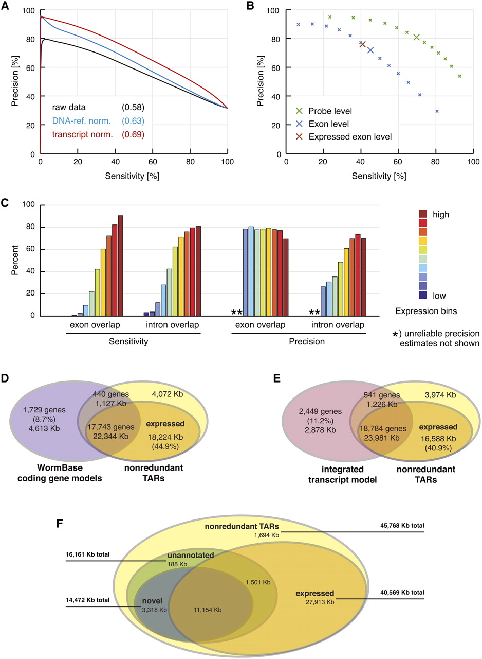 De novo transcript identification with mSTAD and overlap of TARs with annotated and experimentally defined gene models. (A) Transcript normalization (red) improved exon probe recognition over raw data (black) and compared with normalization using genomic DNA hybridization as reference (blue). Sensitivity and precision were estimated after thresholding the intensity data with increasing cutoffs in a fivefold cross-validation. Sensitivity is defined as the percentage of exon probes with signal above the threshold among all annotated exon probes. Precision is defined as the percentage of annotated exon probes among those with signal above the threshold (see Methods). Values in parentheses indicate area under the curve. Based on data from LE-ref (see Table 1). (B) Cross-validation accuracy of mSTAD for probes (green), for exons (blue), and for exons with independently confirmed expression (brown). For exons, sensitivity is defined as the percentage of annotated exons for which all corresponding tiling probes were predicted as exonic by mSTAD. Precision is defined as the percentage of predicted exons for which all probes are annotated as such. Definitions for probes are as in A but with respect to predictions by mSTAD. Exon-level evaluation was repeated with the subset of predicted exons also detected as expressed by a statistical test (see Expressed Exon Level). Enlarged crosses correspond to predictions used for subsequent analysis. Based on data from LE-ref (Table 1). (C) Accuracy of exon and intron recognition increased with gene expression. Colored bars correspond to equally sized expression bins. Here exon overlap sensitivity equals the percentage of predicted exons, which overlap by at least 75% of their length with annotated exons. Exon overlap precision equals the percentage of exon predictions overlapping with annotated exons (by 75% or more) among all predicted exons (intron overlap sensitivity and precision are defined analogously with respect to predicted and annotated introns). Based on data from LE-ref (Table 1). (D) Overlap between nonredundant TARs (nrTARs), the portion detected as expressed and annotated coding gene models. About 45% of expressed nrTAR bases do not overlap with annotated coding gene models. (E) Overlap between TARs and the modENCODE integrated transcript model (Hillier et al. 2009; Gerstein et al. 2010). About 41% of expressed nrTAR bases do not overlap with the integrated transcript model. (F) Unannotated and novel TARs and their overlap with TARs expressed above array background. Unannotated TARs are defined as TARs without significant overlap (≥20 bp) with exons of annotated coding genes, pseudogenes, and ncRNAs. Novel TARs are defined as the subset of unannotated TARs without significant overlap (≥20 bp) with exons in the integrated transcript model (for details, see main text).