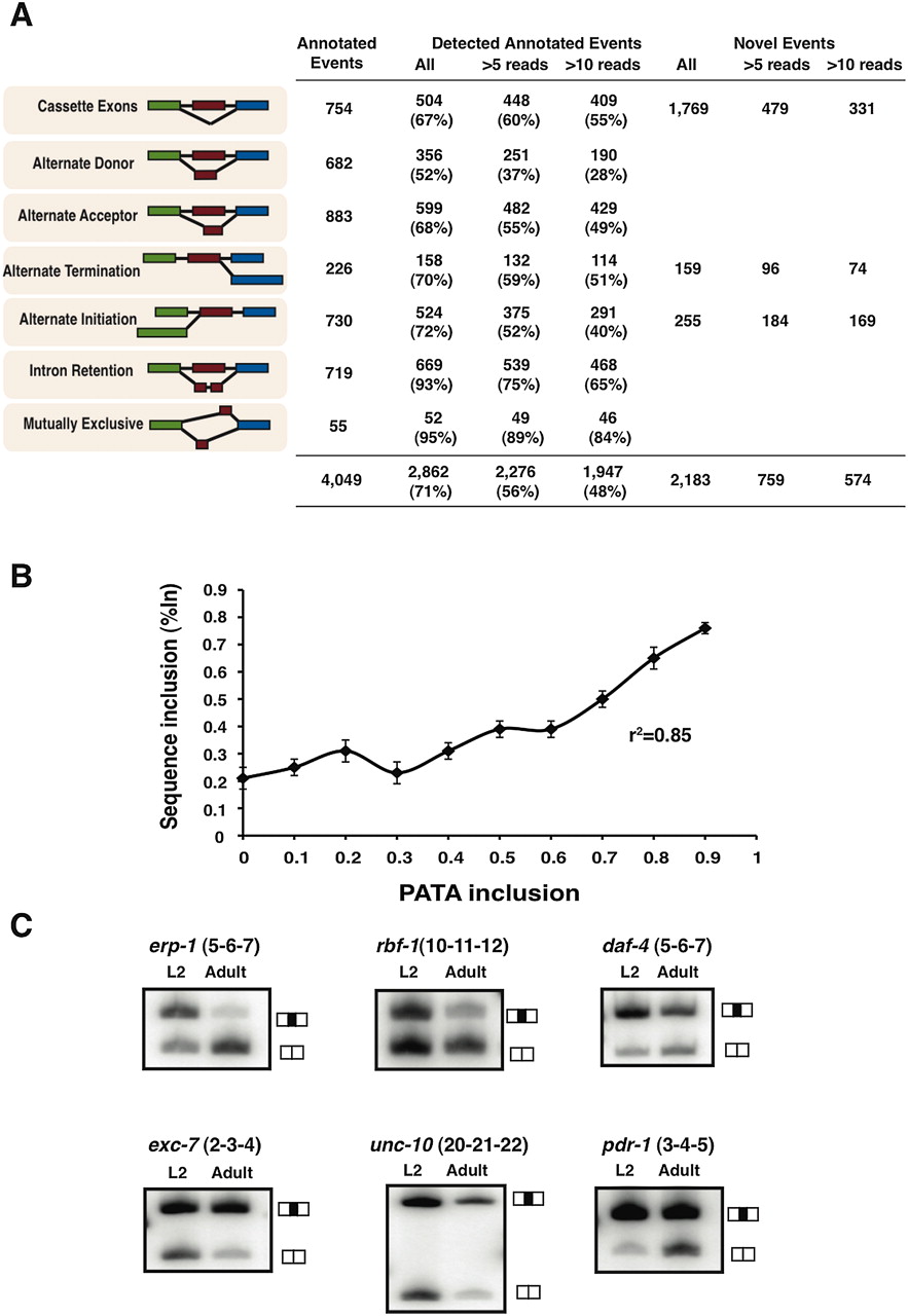 Identification of known and novel AS events. (A) Table displaying the proportion of different classes of AS events annotated in WormBase that are identified by our RNA-seq analysis with varying degrees of junction count support. Also listed in the last three columns are the number of unannotated AS events identified by our analysis and the number of reads supporting these splice junctions. (B) We compared the %In values for a set of 317 annotated cassette AS events from the true positive set that were detected both by RNA-seq analysis and by our microarray platform. For these AS events, RNA-seq derived %In values profiled across four developmental stages (L2, L3, L4, and adults) were compared to the PATA derived %In values in the same stage. The plot shows a high correlation between the two platforms indicating that both methods are reliable estimates of relative isoform usage. (C) RT-PCR validation of a subset of unannotated AS events in the larval (L2) and adult developmental stages. Primers were designed to anneal to sequences corresponding to neighboring constitutively spliced exons, amplifying two products: one representing isoforms including the alternative exon in transcripts (top bands in gel images) and the other one skipping the alternative exon (bottom bands).