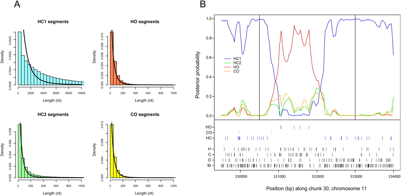 (A) The distribution of fragment lengths supporting each of the four states. A geometric distribution (full line) is fitted to the observed distribution. (B) Examples of an alignment supporting the alternative [(H,O),C] genealogy. The top of the figure shows the posterior probability of being in the basic state (HC1) or in each of the three alternative states (HC2, HO, or CO). The bottom of the figure indicates informative sites and singletons.