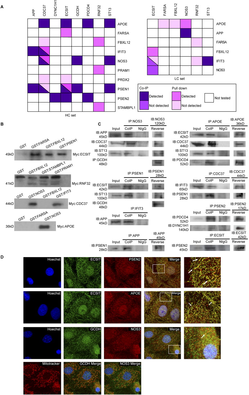 Validation of Y2H interactions by downstream binding assays. In vitro binding experiments: (A) schematic diagrams showing the interactions examined by co-IP or pull-down experiments, for the high-confidence (HC) and low-confidence (LC) sets, respectively; (B) by GST pull-down, blotting with anti-MYC antibody to detect the bound partner; (C) by coimmunoprecipitation (CoIP), blotting with a specific antibody for the bound partner, respectively. (Input) Cell lysate, used as loading control; (IP) immunoprecipitated protein; (IB) immunoblotted protein; (NIgG) nonimmune rabbit or mouse immunoglobulins, used as negative IP controls. When using NIgG as IP agent, no precipitation lines were detected against IB antibodies, indicating that CoIPs were protein-specific. Furthermore, reverse CoIPs using IB antibodies as IP agents, followed by IP antibodies for blotting, led to the same results in almost all cases, hence confirming the interactions. Expected molecular weights are also indicated. (D) In vivo colocalization of interacting partners by double immunofluorescence staining using confocal microscopy. (Upper panel) Double immunofluorescence confocal micrographs, labeled with a rabbit anti-ECSIT antibody and a secondary Alexa488-labeled anti-rabbit IgG (visualized in green pseudocolor), and with a mouse anti-PSEN2 visualized in red pseudocolor with a secondary Alexa568 labeled anti-mouse IgG (Invitrogen). Colocalized immunolabeling (merged window) appears as yellow staining in some areas (a framed area is also displayed in greater detail, see white arrows). Nuclei are displayed in blue by Hoechst staining. (Second panel) Double immunofluorescence of ECSIT and APOE following the same procedure. APOE was labeled with a mouse anti-APOE and an Alexa568 (visualized in red pseudocolor). (Third panel) Double immunofluorescence of GCDH labeled with a rabbit anti-GCDH and an Alexa488 (visualized in green pseudocolor), and NOS3 labeled with a mouse anti-NOS3 and an Alexa568 (visualized in red pseudocolor). (Bottom panel) Mitochondria staining with MitoTracker Deep Red stain (visualized in red pseudocolor). Merging with GCDH and NOS3 labeling, respectively, appears as yellow staining, indicating their mitochondrial localization.