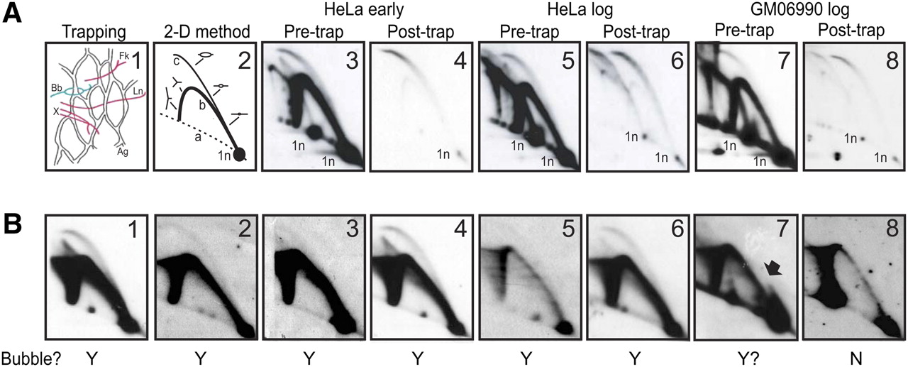 The trapped material, as well as the early S-phase HeLa test library, are extremely pure. (A) Frame 1 illustrates the principle of the bubble-trapping procedure, with agarose (Ag) indicated by the network, bubbles (Bb) indicated in red, and single forks (Fk), termination structures (X), and linear fragments (L) indicated in green. Frame 2 diagrams a 2D gel separation of replication intermediates, in which fragments with centered bubbles trace curve c, single forks trace curve b, and linear fragments correspond to the 1n spot. Frames 3, 4, 5, 6, 7, and 8 illustrate the composition of replication intermediates in the rDNA origins before and after trapping in agarose for the early S-phase HeLa sample, one of the log-phase HeLa samples, and the log-phase GM06990 sample, respectively. Note that all samples display two 1n spots, which arise from an RFLP at an EcoRI site in the multiple copies of the rDNA locus; only the smaller 12-kb RFLP is detected in the early S-phase samples, while 12- and 18-kb variants are both detected in the log-phase HeLa and GM06990 samples. (B) Eight anonymous cloned fragments from the early S-phase library ranging from 4 kb to 11 kb in length were tested for authenticity by analyzing their cognate genomic restriction fragments with suitable single-copy probes in 2D gels. Fragments 1–6 all display a composite pattern (complete bubble and single fork arc) indicative of initiation zones, while fragment 7 may correspond to a fixed, off-centered origin. The Y and N below each panel indicate whether each candidate actually displayed a bubble arc.