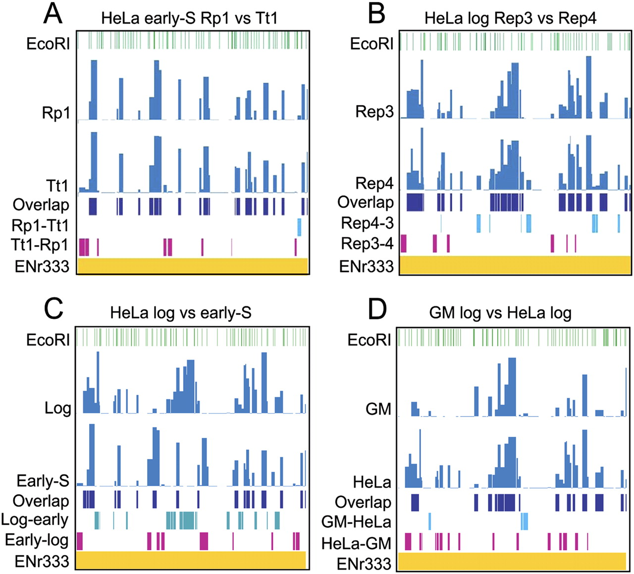 MedRI origin maps reveal bubble fragment clustering, effects of cell synchronization, and major differences in origin distribution between GM06990 and HeLa cells. Four different medRI comparisons are shown for ENr333 in the second and third rows of each panel, with the fourth row indicating overlaps, and fifth and sixth rows representing the nonoverlapping fragments. The notation X–Y indicates fragments in sample X that were not detected in sample Y. Note also that the signals in the last three rows are proportional to the width of each EcoRI fragment, but not the signal strengths. (A) Comparison of Rp1 and Tt1 hybridizations with the early S-phase HeLa library. (B) Comparison of Rep3 and Rep4 biological replicate log-phase HeLa libraries. (C) Comparison of log-phase and early S-phase HeLa libraries. (D) Comparison of log-phase HeLa and GM06990 origin libraries.