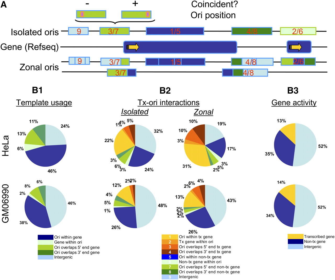 Origin–gene interactions are markedly different between isolated and clustered fragments, and between HeLa and GM06990 cells. (A) The black lines represent the DNA template with genes (Refseqs) and bubble-containing fragments, whether isolated or clustered, indicated as rounded or square boxes, respectively, on the axis. Origin fragments are colored either light-blue (intergenic), dark-blue (genic), or light or dark-green (overlapping indeterminate). The yellow arrow indicates the direction of transcription. The box numbers correspond to the nine categories summarized in the text, below B2, and in Table 1. The two green boxes at the top illustrate the ambiguity associated with a fragment that only partly overlaps a gene, since the transcribed part might not overlap the part that initiates replication. (B1) Origin distributions relative to DNA template sequences, where the light-blue sector is intergenic, dark-blue is genic, and the three different green sectors represent categories 6–8, which overlap genes (indicated by key below). (B2) Distribution of isolated or clustered bubble-containing fragments among intergenic (light-blue), completely nontranscribed genic (dark-blue), partially overlapping nontranscribed genic (three green sectors), or completely or partially overlapping transcribed genomic regions (yellow-to-orange sectors; see key below). (B3) Percentages of the HeLa and GM06990 genomes that are intergenic (light-blue), nontranscribed genic (dark-blue), or transcribed (yellow; see key below).