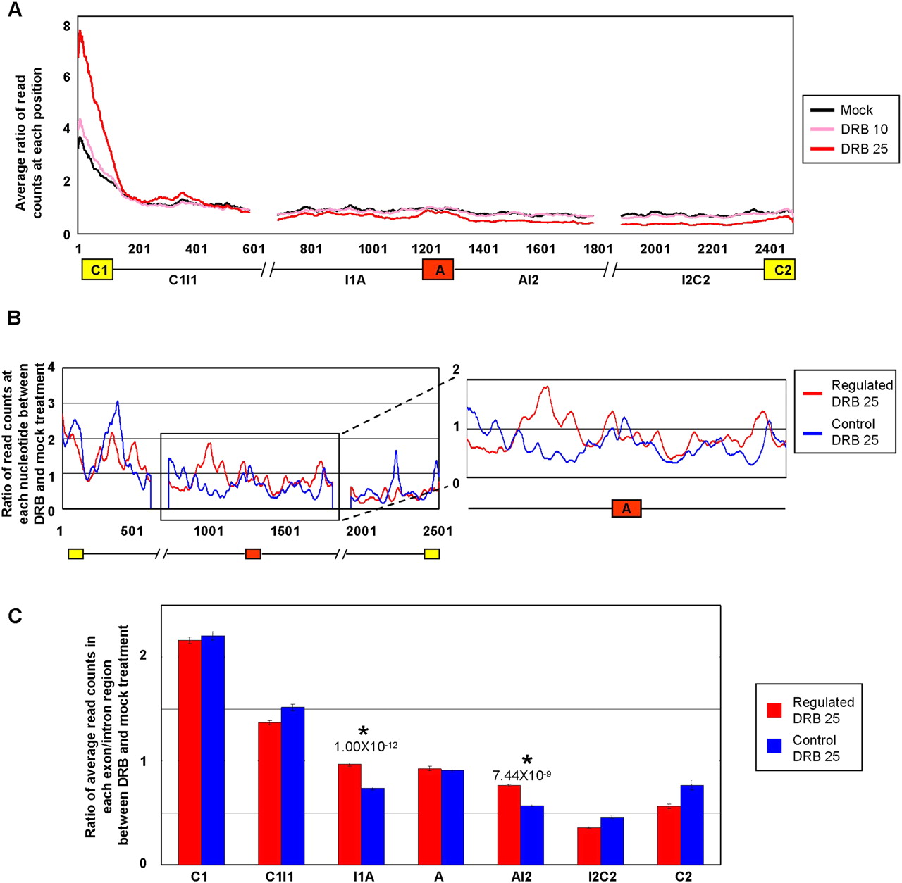 Increased Pol II occupancy over intron sequences flanking alternative exons that display Pol II elongation rate-dependent regulation of AS. Jurkat cells were treated with or without DRB as described in Figure 1, cross-linked with formaldehyde, and Pol II cross-linked to sheared chromatin fragments was immunoprecipitated with a monoclonal antibody (4H8) specific for the Pol II CTD. Illumina short (44 nt) sequence reads were generated from the immunoprecipitated chromatin fragments and these were mapped to the exons and flanking 500 nt intron sequences, corresponding to the C1–A–C2 regions analyzed by microarray profiling in Figure 1. C1, first/upstream constitutive exon; C2, second/downstream constitutive exon; A, alternative exon; I1, first/upstream intron; I2, second/downstream intron. (A) Plots showing merged distributions of Pol II over the profiled exons and intron sequences of all microarray profiled genes. The Pol II distributions are shown as averages of ratios of read counts at each position over a value representing the total number of reads mapped to all exons and introns in the gene set over the total length of the exons and introns in that set. Lengths of exons were normalized by binning into 100 equal-size segments to facilitate direct comparison. Plots are shown for mock (control) treatment and treatments with 10 and 25 μg/mL DRB. (B) Pol II occupancy for microarray-profiled genes with DRB (25 μg/mL)-dependent increases in exon inclusion and decreases in mRNA levels, designated as “Regulated” genes (red trace). A similar number of genes with comparable mRNA levels but that do not detectably respond to DRB (25 μg/mL) are shown for comparison, designated as “Control” genes (blue trace). Additional control traces are shown in Supplemental Figure S11. The traces show the average ratios of read counts at each position over a sliding window of 20 nt in the DRB-treated versus mock-treated samples (see Methods for details). (C) Bar graph quantifying average ratios of Pol II occupancy within each indicated region, as determined from the data in panel B. Regions displaying significant increases in Pol II occupancy in the DRB-treated relative to mock treated samples, between the Regulated and Control sets of genes, are indicated. Error bars indicate standard error and P-values were calculated using Wilcoxon signed-rank test.
