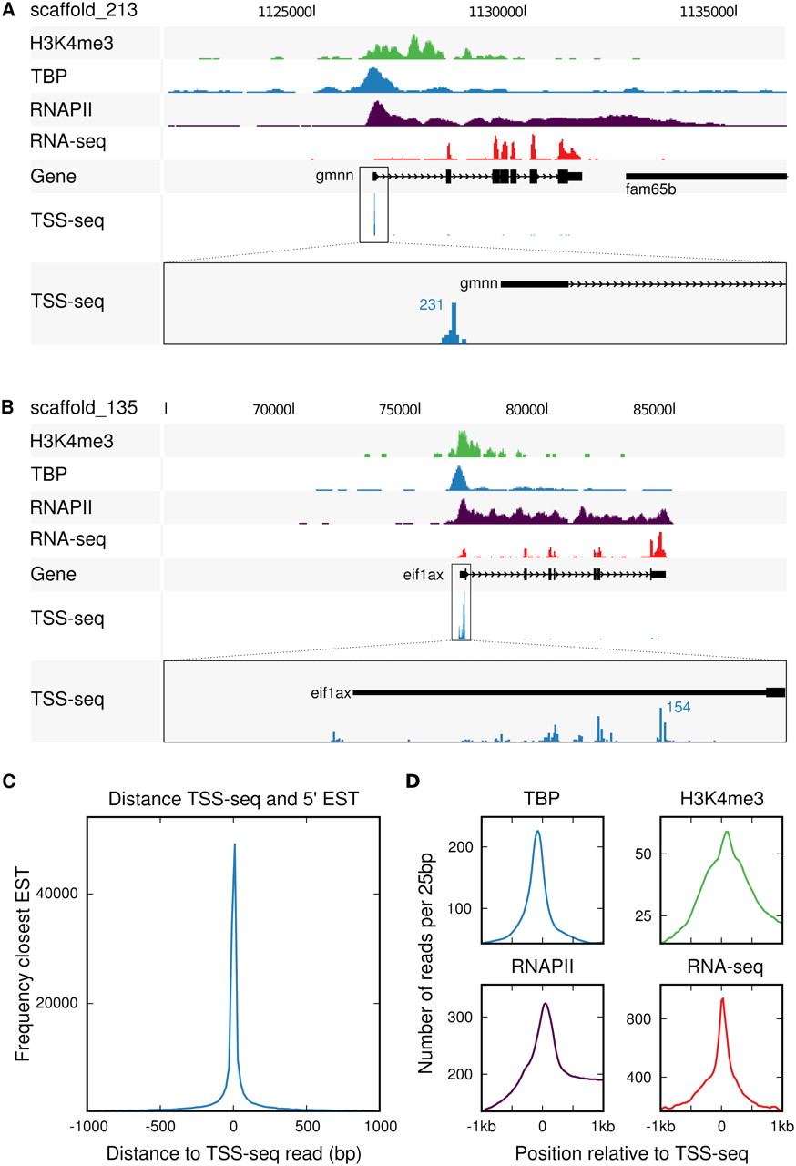 TSS-seq accurately defines transcription start sites. (A) Focused transcription initiation at the gmnn gene locus on scaffold_213, visualized using the UCSC Genome Browser. Shown are ChIP-seq profiles for (from top to bottom) H3K4me3 (green), TBP (blue), and RNAPII (purple), as well as RNA-seq data (red). The reads obtained by sequencing the 5′ end of oligo-capped transcripts (TSS-seq) are shown in the lower two tracks. The lower track shows a 90× magnification of the TSS-seq track. (B) Dispersed transcription initiation at the eif1ax gene locus on scaffold_135, visualized using the UCSC Genome Browser. (C) Histogram of the distance between the TSS-seq reads and the 5′ end of the closest EST, summarized for every TSS-seq read. (D) ChIP-seq profiles of TBP (blue, upper left), H3K4me3 (green, upper right), and RNAPII (purple, lower left), as well as RNA-seq (red, lower right), around the start position of TSS-seq reads.