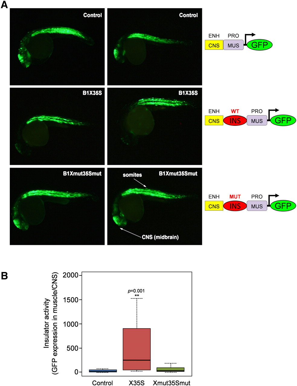 B1-X35S has insulator activity in zebrafish. (A) B1-X35S and mutant B1Xmut35Smut in the enhancer+promoter-driven GFP vector, as illustrated, were microinjected into one-cell zebrafish embryos. Each animal was photographed and GFP signals quantified in CNS and somites. Measurements of individual zebrafish are shown in Supplemental Figure 2. (B) Insulator activity was calculated as the median GFP signal in muscle/CNS for each experimental condition. Data are shown as mean ±SD.