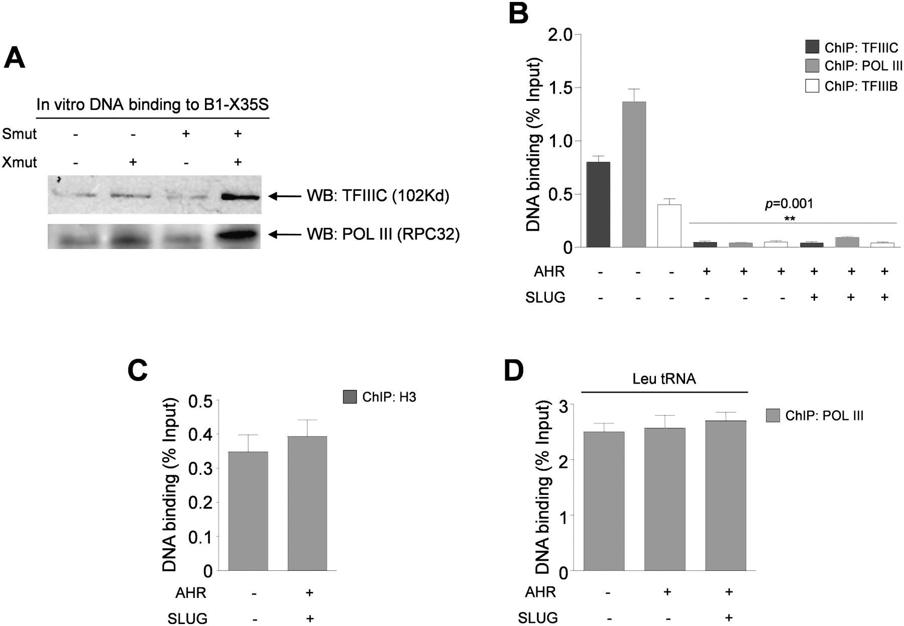 Pol III binds B1-X35S: role of AHR and SLUG. (A) In vitro binding of Pol III and TFIIIC to B1-X35S, B1-Xmut35S, B1-X35Smut, or B1-Xmut35Smut was analyzed by DNA-binding affinity assays. (B) qChIP to address whether AHR and SLUG expression block Pol III recruitment to B1-X35S in vivo after transient transfection of Hepa-1 cells with AHR alone or with SLUG. (C,D) AHR was expressed with or without SLUG and their effects on histone H3 binding to B1-X35S (C) or Pol III binding to tRNALeu genes (D) determined by qChIP. (B,C) Average data from five B1-X35S-containing genes (Dad1, Lpp, Cabin1, Tbc1d1, and Rtl1). Data are shown as mean ±SD.