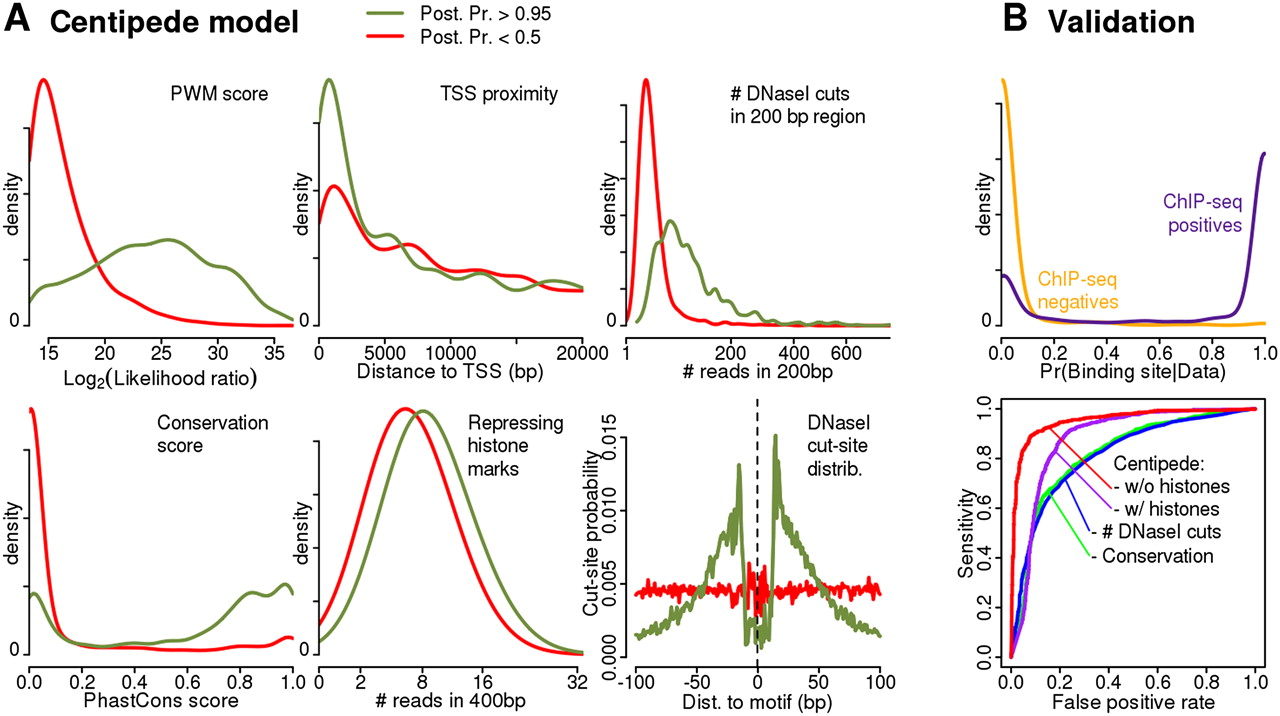 Model learned by the CENTIPEDE approach for the transcription factor REST. (A) Empirical density plots for key aspects of the data for sites inferred by CENTIPEDE to be bound (green lines, CENTIPEDE posterior probabilities >0.95) and unbound (red lines, probabilities < 0.5), respectively. The right-hand column shows comparison to REST ChIP-seq data. (B, upper plot) The distribution of CENTIPEDE posterior probabilities for ChIP-seq positives (motif inside a ChIP-seq peak, as reported by ENCODE using MACS) (Zhang et al. 2008) and for ChIP-seq negatives (fraction of reads from the control experiment is lower or equal compared to that from the ChIP experiment). (Lower plot) ROC curves for four methods of ranking binding sites. In decreasing order of performance, these are CENTIPEDE with DNase I data; CENTIPEDE with DNase I data and histone marks; number of DNase I reads within 200 bp; phastCons conservation score.