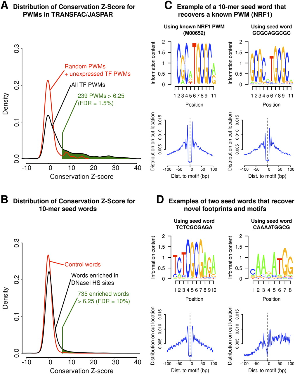 Application of the CENTIPEDE model across 756 known PWMs and 17,224 10-mers enriched in DNase I–sensitive regions. (Left panel) The distribution of the conservation Z-score for PWM motifs (A) and 10-mer derived motifs (B). (C) This panel shows that NRF1 binding sites are recovered from both the PWM and 10-mer-based approach. (D) Two examples that appear to be novel binding site motifs. For these motifs, locations inferred to be bound are strongly conserved, show a clear DNase I footprint, and show minimal overlap with known PWMs.