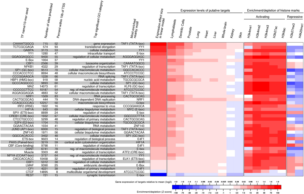 Characteristics of the binding sites for 41 selected motifs. For each motif, we show the total number of inferred active sites (posterior probability > 0.99); the percentage of active sites that are within 1 kb of the nearest TSS; the most enriched GO category of the genes with a TSS within 5 kb of an active site; and the most enriched nonoverlapping element within 100 bp of the motif; the average shift in mean expression for genes containing an active binding site of each element in their promoter region (5 kb from TSS) in the linear model; the difference from average expression of the putative TF targets across nine tissues (Su et al. 2004); a Z-score measuring the enrichment/depletion of seven histone modification marks in the 400-bp region around the bound instances of each motif relative to unbound instances.