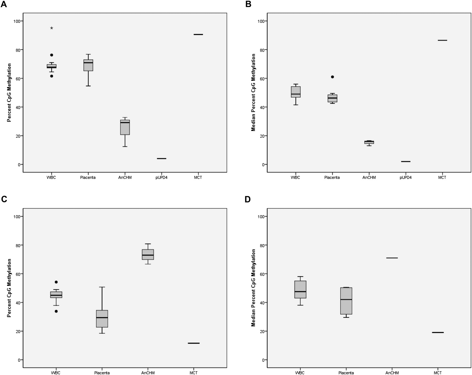 CpG methylation in new candidate differentially methylated regions (DMRs) for the imprinted genes NAP1L5 and ZNF597. (A) Box-and-whisker plot showing the distribution of CpG methylation percent for each tissue at the NAP1L5 CpG site cg01026744 from the Illumina Infinium Human Methylation 27 BeadChip microarray. The methylation data are derived from 16 blood samples, five placenta samples, three AnCHM samples, one paternal UPD4 lymphoblastoid sample, and one MCT sample. (B) Box-and-whisker plot showing the median percent CpG methylation for six consecutive CpG sites at NAP1L5 DMR for each tissue. The bisulfite pyrosequencing data are derived from 15 blood samples, 10 placenta samples, three AnCHM samples, one paternal UPD4 lymphoblast sample, and one MCT sample. (C) Box-and-whisker plot showing the distribution of CpG methylation percent for each tissue at the ZNF597 CpG site cg14654875 from the Illumina Infinium Human Methylation 27 array. The methylation data are derived from 16 blood samples, five placenta samples, three AnCHM samples, and one MCT sample. (D) Box-and-whisker plot showing the median percent CpG methylation for seven consecutive CpG sites within the ZNF597 DMR for each tissue. The bisulfite pyrosequencing data are derived from 14 blood samples, four placenta samples, one AnCHM sample, and one MCT sample.