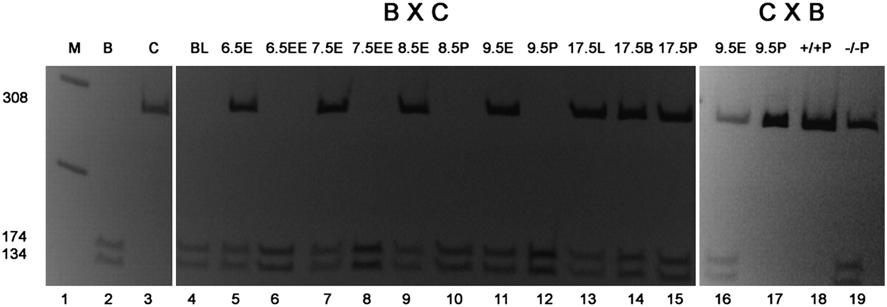 Allelic expression analysis for the new candidate imprinted gene Axl in mouse. Shown here are cDNA amplified using Axl primers digested with Hpy188III enzyme that cuts a polymorphic sequence specifically on the C57BL/6 allele. Direction of the cross (Maternal X Paternal) is indicated as BXC or CXB (B = C57BL/6; C = Cast). The lanes are as follows: 1: M (marker); 2: B, for digestion (control); 3: C, for no digestion (control); 4: BL (blastocyst); 5: 6.5E (6.5 dpc embryonic tissue); 6: 6.5EE (6.5 dpc extra-embryonic tissue); 7: 7.5E (7.5 dpc embryonic tissue); 8: 7.5EE (7.5 dpc extra-embryonic tissue); 9: 8.5E (8.5 dpc embryo); 10: 8.5P (8.5 dpc placenta); 11 and 16: 9.5E (9.5 dpc embryo); 12 and 17: 9.5P (9.5 dpc placenta); 13: 17.5L (17.5 dpc liver); 14: 17.5B (17.5 dpc brain); 15: 17.5P (17.5 dpc placenta); 18: +/+P (9.5 dpc Dnmt1 +/+ placenta); and 19: −/−P = 9.5 dpc Dnmt1 −/− placenta. Exclusive maternal expression of Axl was detected starting in blastocyst (n = 2), in the extra-embryonic tissues of all examined E6.5 concepti (n = 6), and subsequently in variable proportions of extra-embryonic tissues of 7.5 dpc (2/4), 8.5 dpc (1/4), and 9.5 dpc (6/9) mice. Embryonic tissues from 6.5 dpc (4/4), 7.5 dpc (4/4), 8.5 dpc (4/4), 9.5 dpc (8/9), and 17.5 dpc (2/2) concepti, as well as from 17.5 dpc placentas (2/2), showed equal maternal and paternal expression. While 4/6 placentas from 9.5 dpc Dnmt1 (n allele) +/+ mice showed biased maternal expression, all Dnmt1 −/− placentas exhibited equal expression from the parental alleles (n = 3).