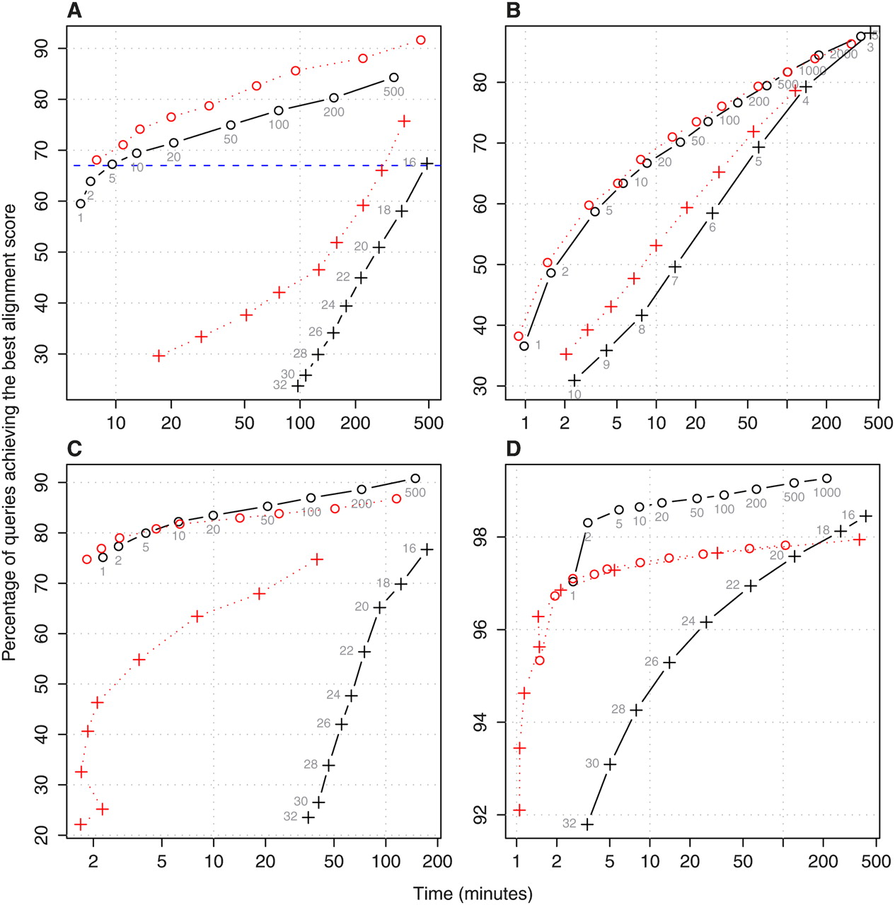 Performance comparison of adaptive seeds (circles) versus fixed-length seeds (crosses). Black denotes results obtained for contiguous seeds and unmasked sequences (l or f parameters are shown next to each data point). Red shows the effect of spaced seeds, subset seeds, or repeat-masking for the sequence alignment of: (A) H. sapiens promoters to the M. musculus genome (and spaced seed 111010010100110); (B) D. melanogaster protein sequences to those of C. elegans (and subset seeds); (C) P. yoelii contigs to the P. falciparum genome (and soft-masking with Tandem Repeats Finder); and (D) short DNA reads from 454 Life Sciences (Roche) GS 20 for A. thaliana against its genome (and soft-masking with WindowMasker).