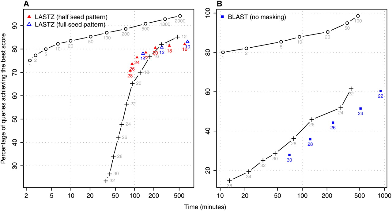 LASTZ and BLASTN use fixed-length seeds and present similar performance to LAST with fixed-length seeds. (Circles) LAST adaptive seeds; (crosses) LAST fixed-length seeds. (A) P. yoelii contigs are aligned to P. falciparum chromosomes using the same score matrix as in Figure 3C. Triangles show performance of LASTZ executed with corresponding parameters for different LASTZ-seed lengths. (B) A simpler match/mismatch scoring scheme is used. Squares present the performance of BLASTN and the numbers correspond to BLASTN-seed lengths.