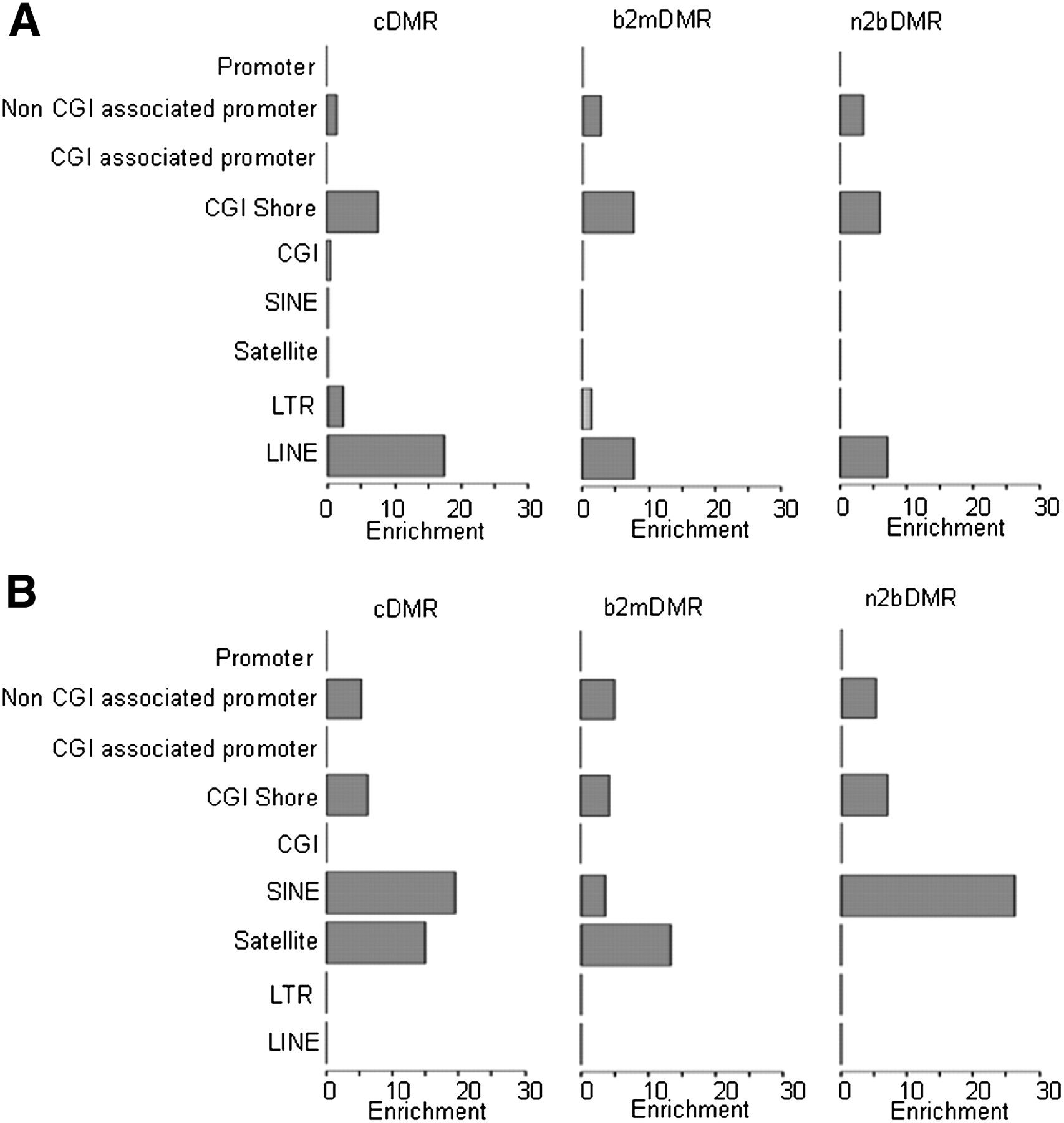 Relative DMR enrichment. Relative enrichment of DMRs in CGI, CGI shore, promoter, and repeat regions (SINE, satellite, LTR, and LINE), for hypermethylated (A) and hypomethylated (B) DMRs for the three sample comparisons (n2bDMRs, b2mDMRs, and cDMRs). Relative enrichment analysis was carried out on the number of DMRs in each genomic feature compared to the expected number. Features with significant relative enrichment (P < 0.001) are highlight in red. The x-axis shows the relative enrichment score; the y-axis, the relevant genomic features.