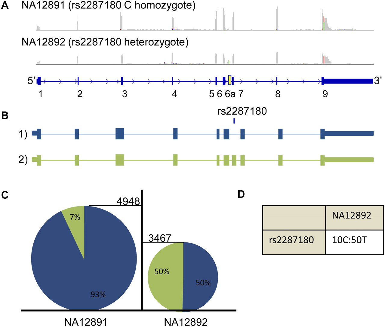 Correlation of SNP rs2287180 to overall MMAB transcript expression and to expression of MMAB novel exon 6a. (A) Screenshots taken from IGV illustrating the read coverage of MMAB. The maximum height for both tracks is set to 700. (B) The different MMAB isoforms seen in the alignment. (C) The percentage of transcripts (color-coded as in B) including and excluding exon 6a in NA12891 and NA12892. To measure the transcripts including exon 6a, the number of reads mapping to the junctions 6-6a and 6a-7 was averaged, and to measure the number of transcripts excluding exon 6a, the number of reads mapping to junction 6-7 were counted. The height of each pie chart is representative of the gene expression for MMAB. (D) The number of reads supporting the reference and alternate alleles for rs2287180, respectively, in individual NA12892.