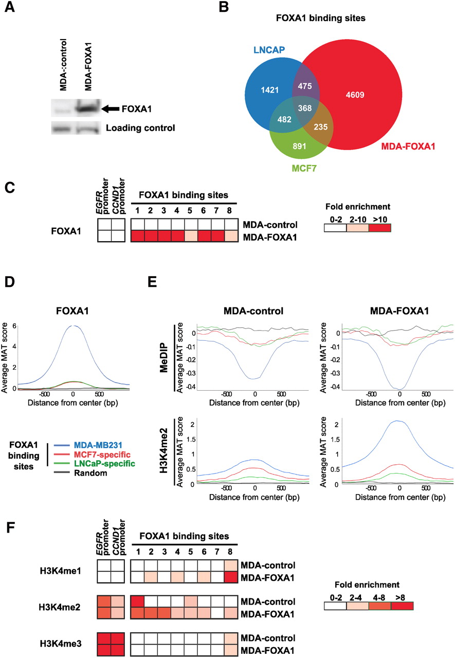 FOXA1 preferentially binds to DNA hypomethylated sites when ectopically expressed in MDA-MB231 cells. (A) Western blot assay showing FOXA1 expression in stably transfected MDA-MB231 cells (MDA-FOXA1). Note that only a faint non-specific band of lower molecular weight is observed in MDA-MB231 cells stably transfected with an empty vector (MDA-control) when the anti-FOXA1 antibody was used. (B) Peaks of FOXA1 enrichment were called using MAT at FDR 1% in MDA-FOXA1 cells and compared to those previously identified in MCF7 and LNCaP cells. Numbers of overlapping and non-overlapping binding sites are indicated on the Venn diagram. (C) ChIP-qPCR validation of eight sites identified by FOXA1 ChIP-chip in MDA-FOXA1. Fold enrichments relative to negative control regions are indicated. Results are from two independent experiments. (D) Average FOXA1-binding levels at MDA-MB231, MCF7-specific, or LNCaP-specific FOXA1 peaks were determined from ChIP-chip data obtained in MDA-FOXA1 cells. A random set of regions from chromosomes 8, 11, and 12 was also analyzed. (E) Average DNA methylation and H3K4me2 levels at FOXA1-binding sites from MDA-FOXA1 cells or at sites specific to MCF7 or LNCaP cells. MeDIP-chip or H3K4me2 ChIP-chip data were obtained in MDA-control or MDA-FOXA1 cells, as indicated. A random set of regions was used as control. (F) ChIP-qPCR experiments were performed in both MDA-control and MDA-FOXA1 cells to determine H3K4me1, 2, and 3 levels at FOXA1-binding sites validated in panel C. Fold enrichments relative to negative control regions are indicated. Results are from three independent experiments.