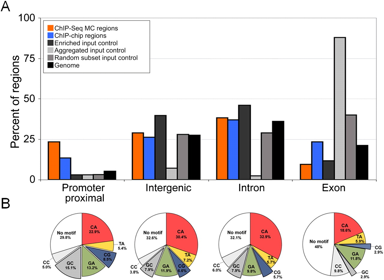 Enrichment of Twist ChIP-seq summits and explanatory E-box motifs in different genic and intergenic locations. (A) Enrichment of Twist ChIP-seq and ChIP-chip summits at particular positions in the genome, relative to a genome random sample and several sequencing negative controls. The genome was segregated into four mutually exclusive categories: promoter proximal (relative to the set of promoters from S. Celniker, including 500 bp upstream), exonic, intronic, and intergenic (see Supplemental Methods). While the majority of Twist regions fall into intergenic and intronic regions, there is a significant overabundance of Twist peaks in promoters relative to the amount of promoters in the genome (24%, or 258 of the ChIP-seq peaks). Intergenic and intronic Twist occurrences are comparable to that expected from a random genomic sample (29%, or 319 intergenic, and 38%, or 420 intronic). The number of summits within exonic regions is relatively disenriched (9%, or 102). In order to assess these numbers compared to expected values, we also compared the same number of Twist ChIP-chip regions (largest by area), the input control DNA regions enriched over Twist, the aggregated input DNA, and a random sampling of sequenced reads mapping uniquely to the genome (see Supplemental Text). We also report the total amount of the genome falling into each of these categories. The aggregated control and, to a lesser degree, the random control reads draw attention to the fact that there are many sequenced reads falling into exons. The enriched control does not show the exon bias perhaps because a directionality requirement was used; there is a mild enrichment of these sequences in the gene flanking category relative to the random genomic sample but a significant depletion in the promoter proximal that is likely due to the fact that Twist peaks are enriched at promoters. (B) The frequency of explanatory E-box sequences as a function of position of Twist-bound peaks in the genome (i.e., promoter proximal, intergenic, intronic, and exonic position). The CA, CG, and GA core E-boxes show enrichment in promoter, intergenic, and intronic positions; the GC core E-box is specifically enriched in the promoter proximal position.