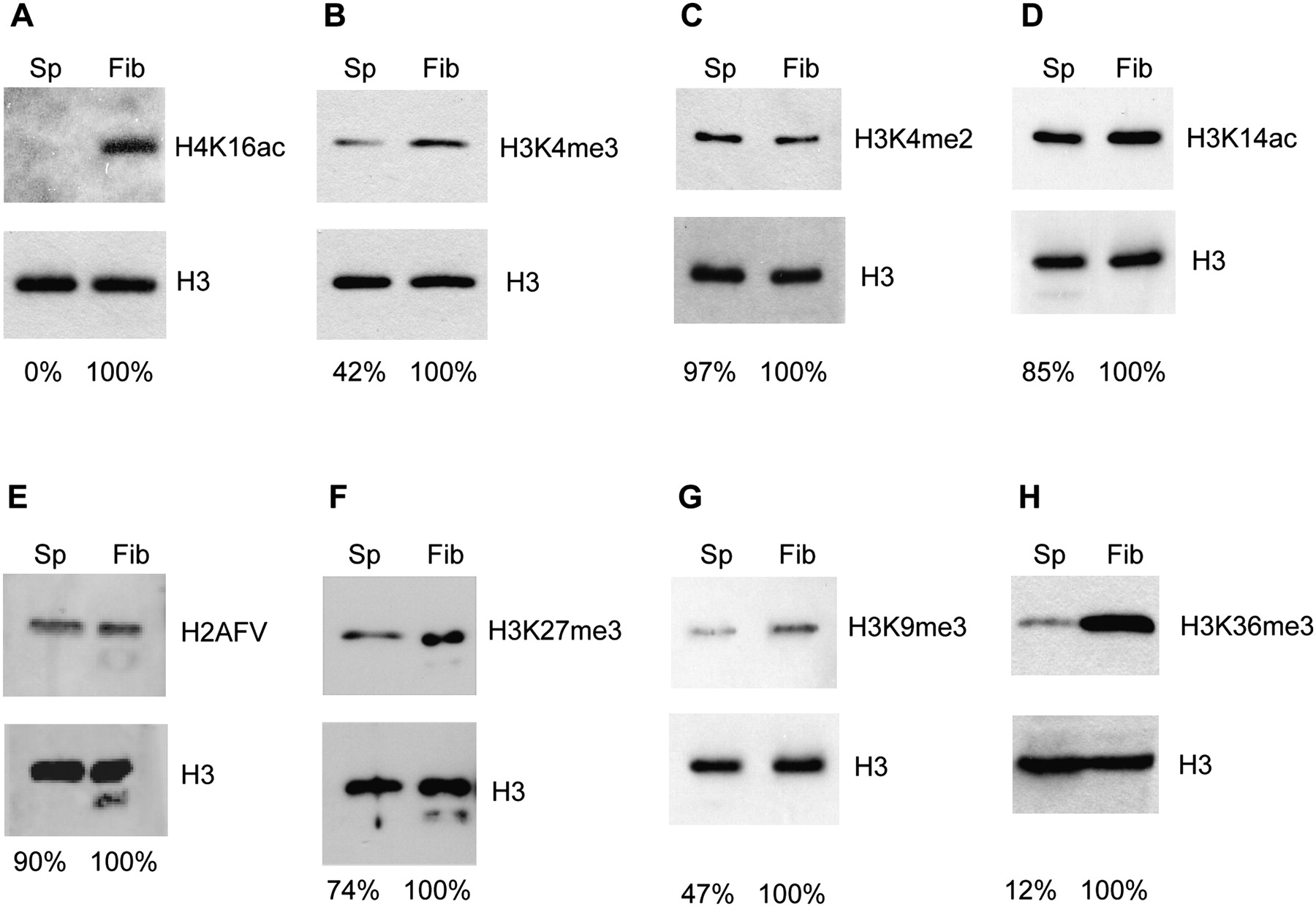 Bulk levels of histone modifications and histone variants in sperm. Immunoblotting was applied to quantify the level of modifications in sperm by comparing to ZF4 fibroblast cells and normalizing with H3 levels. (A) H4K16ac is not detected in sperm. (B–H) The levels of active and repressive marks and a histone variant (H2AFV/H2A.Z) in sperm compared with ZF4 fibroblast cells.