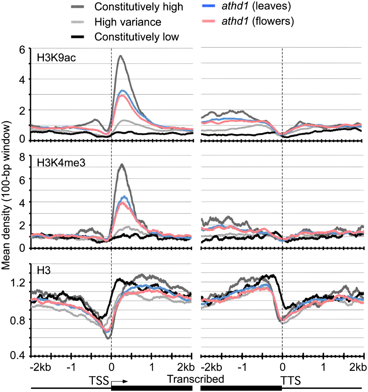 H3K9ac, H3K4me3, and nucleosome densities are correlated with gene expression variations during development. Mean-normalized ChIP-seq densities of 1-bp resolution (y-axis) were plotted within a 4-kb region flanking the TSS or the TTS (x-axis). Genes with the top 10% expression levels (dark gray plots), the lowest 10% expression levels (black plots), and the top 10% highest expression variance (light gray plots), across 63 developmental stages. Genes that were up-regulated in athd1-t1 leaves (blue plots) and flowers (pink plots).