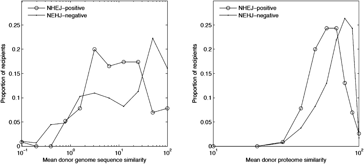 Comparison of genome similarity measures between NHEJ-positive and NHEJ-negative recipients.