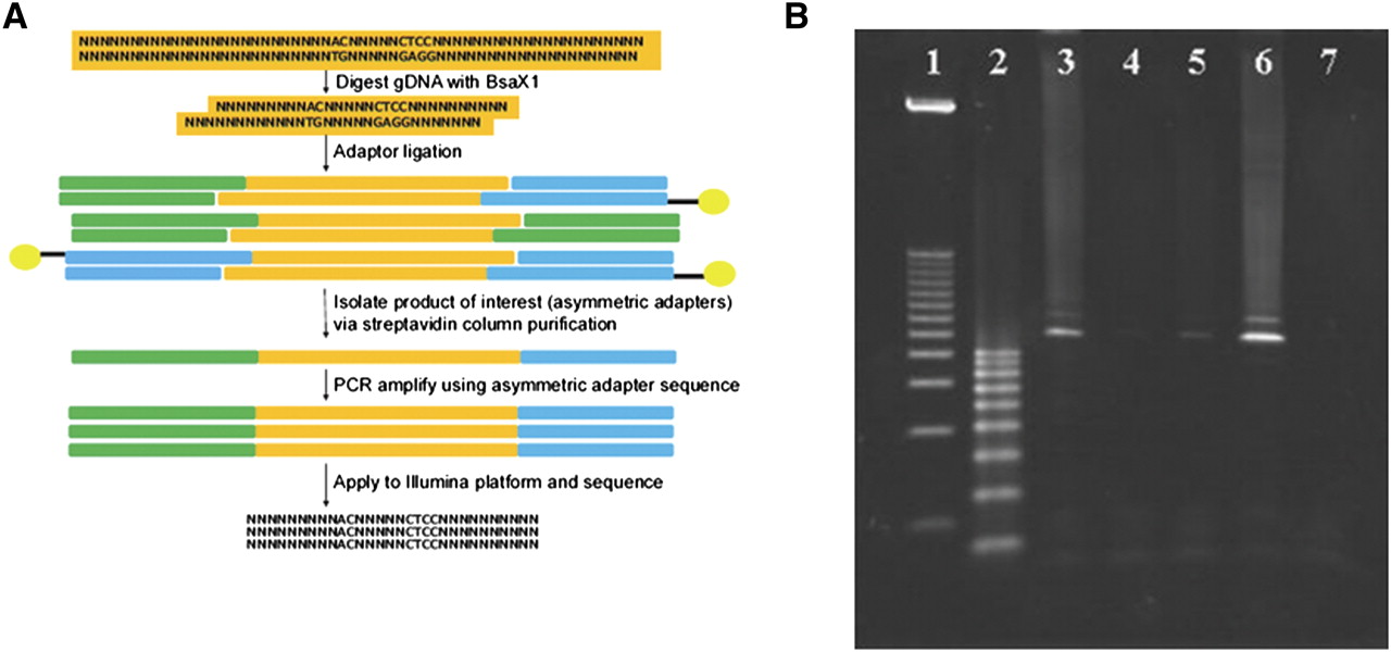 (A) Schematic of BRISK technique. (B) Representative ethidium bromide-stained agarose gel of BRISK products. (Lane 1) 1 kb DNA ladder; (lane 2) 100 bp DNA ladder; (lane 3) PCR amplification of BRISK fragments following ligation of asymmetric adaptors; (lane 4) amplification of unbound material from biotin column; (lane 5) amplification of beads following melt and elution of single-stranded DNA; (lane 6) ampification of material eluted from beads (desired product containing one long and one short adaptor); (lane 7) negative PCR control.