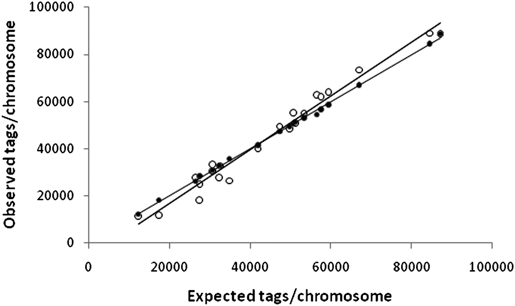Observed vs. expected recovery of sequence tags by chromosome using BRISK from human whole blood sample. (Closed circles) unamplified DNA; (open circles) phi29 amplified DNA.