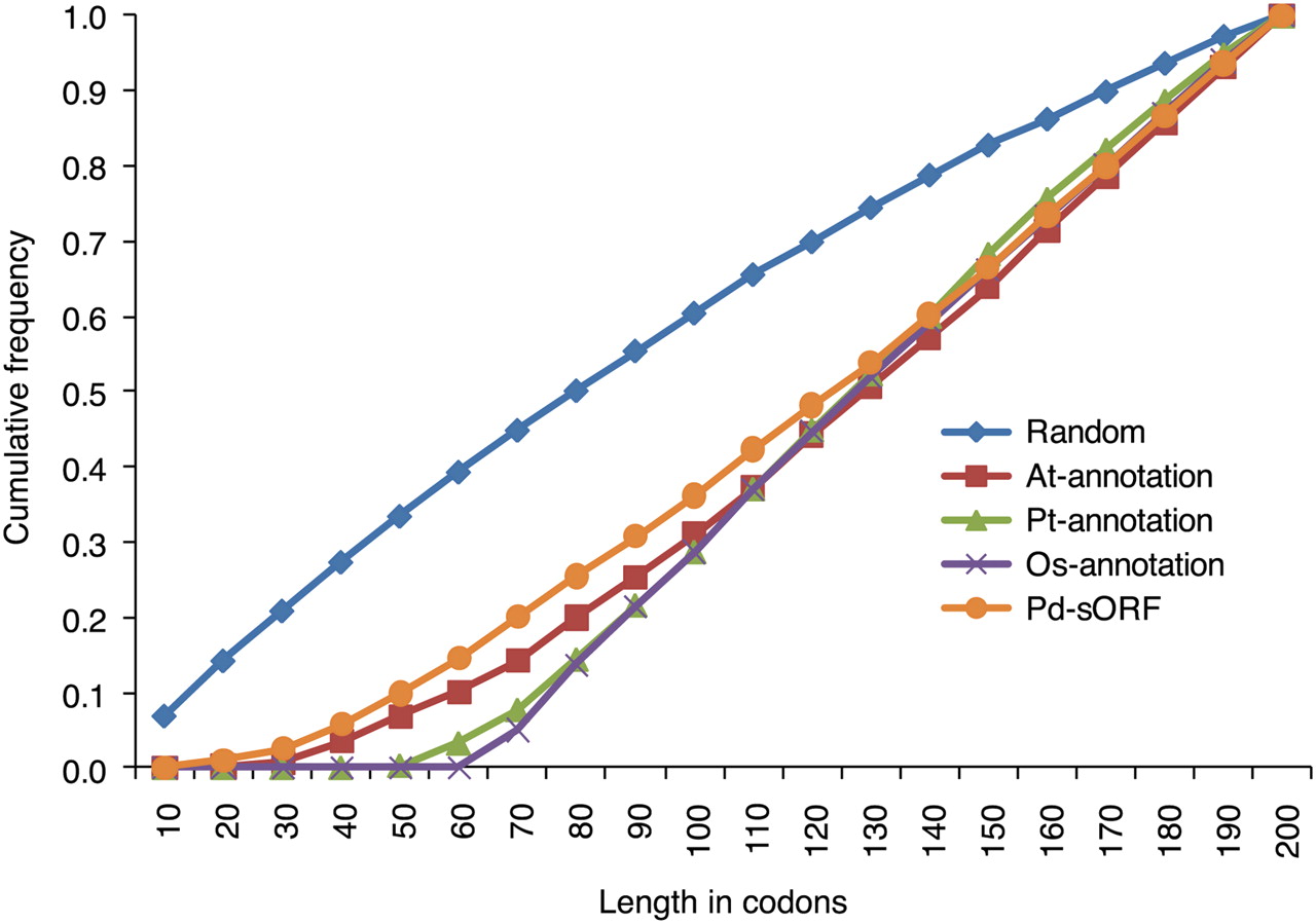 Length distribution of predicted protein sequences. (Random) The random sORFs; (At-annotation) the small proteins in Arabidopsis genome annotation (v9); (Pt-annotation) the small proteins in Populus genome annotation (v2.0); (Os-annotation) the small proteins in rice genome annotation (v6.1); (Pd-sORF) the high-confidence sORF candidate set (Fig. 1) shared by Subsets A, B, and C in Figure 2.