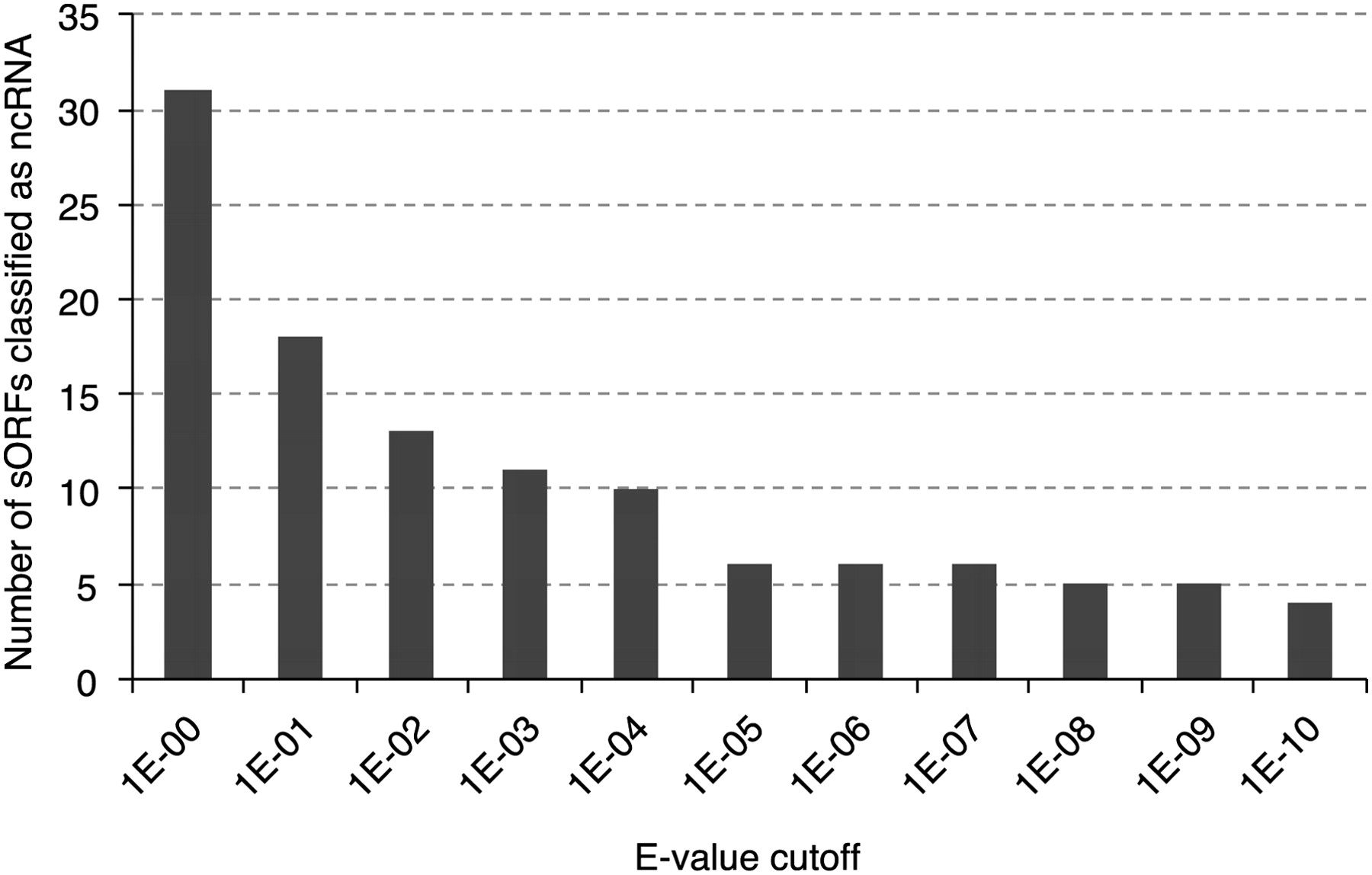 Number of sORFs in the high-confidence sORF candidate set classified as potential ncRNAs by an Rfam database search. The e-value cutoff was used in the Rfam search.