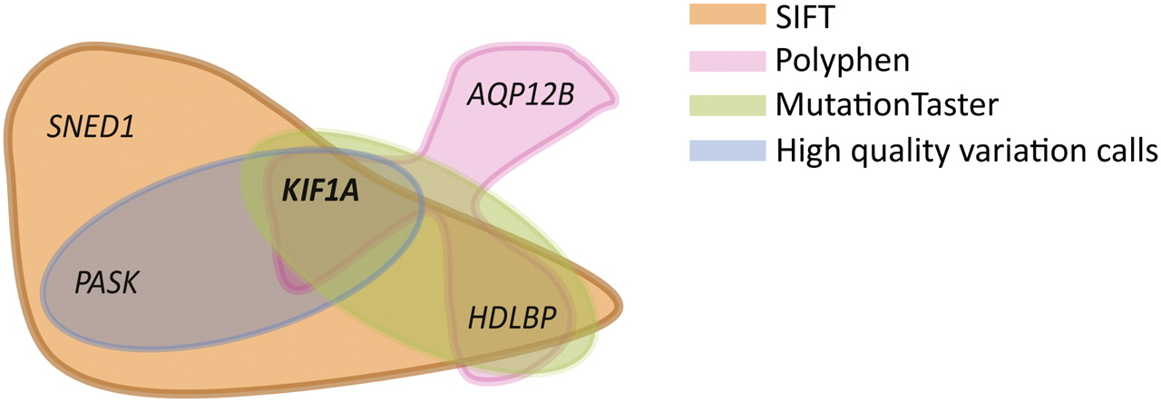 Loss of function prediction: KIF1A scores in all the tools. (Orange) The subset of variations that were predicted as harmful by SIFT. (Pink) Harmful variations by PolyPhen. (Green) Harmful variations by MutationTaster. (Blue) High-quality variations based on SNVmix scores. The HDBLP variation was later proved to be a sequencing error. KIF1A is the only harmful variation.