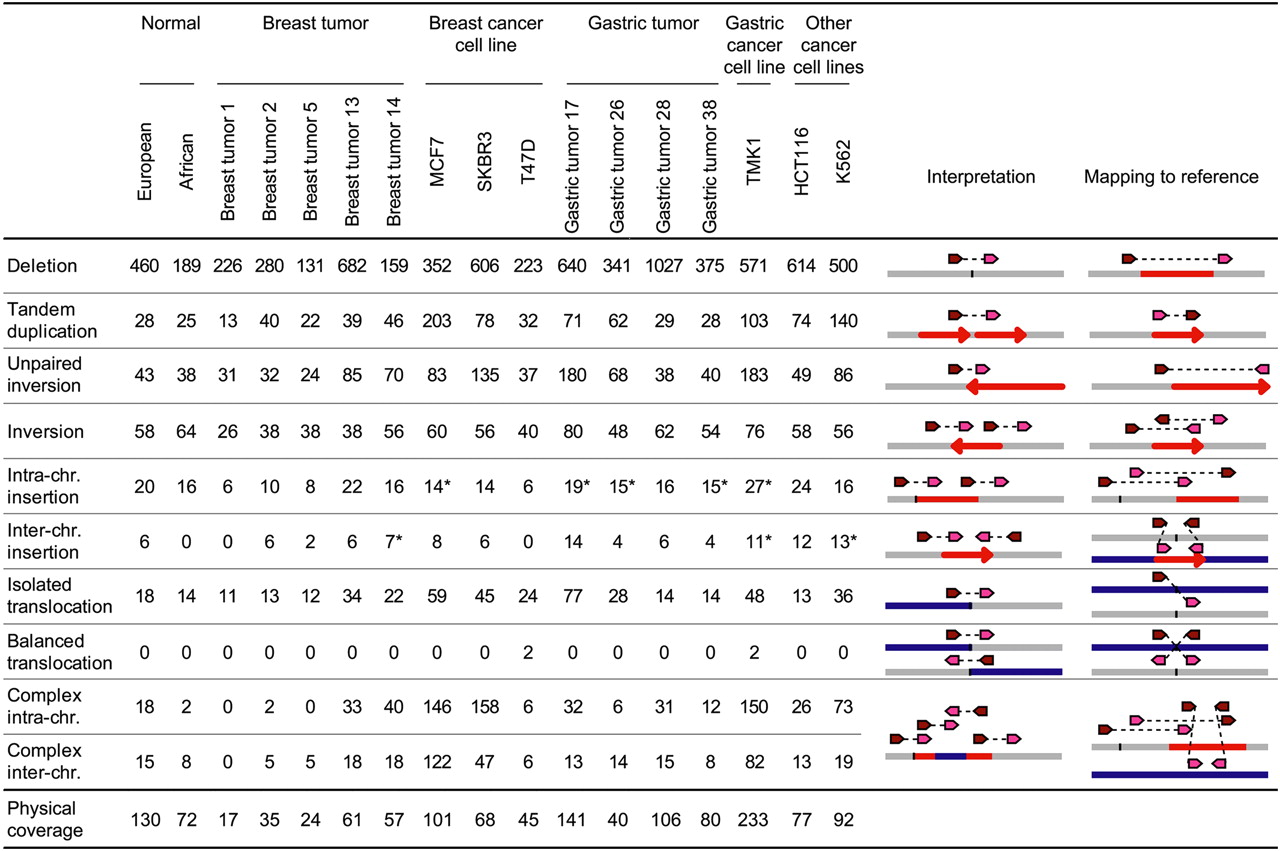 Structural variations (SVs) identified by dPET clusters of 15 cancer and two normal genomes. Column “Interpretation” indicates the genomic structure of the sequenced genome deduced from the mapping pattern of the dPET clusters to the human reference sequence (mapping to reference). Dark red arrows represent 5′ anchor regions and pink arrows represent 3′ anchor regions. Gray, blue, and red horizontal lines represent chromosomal segments. Red arrows indicate orientation of chromosomal segments. Asterisks indicate that clusters have been used for more than one insertion.