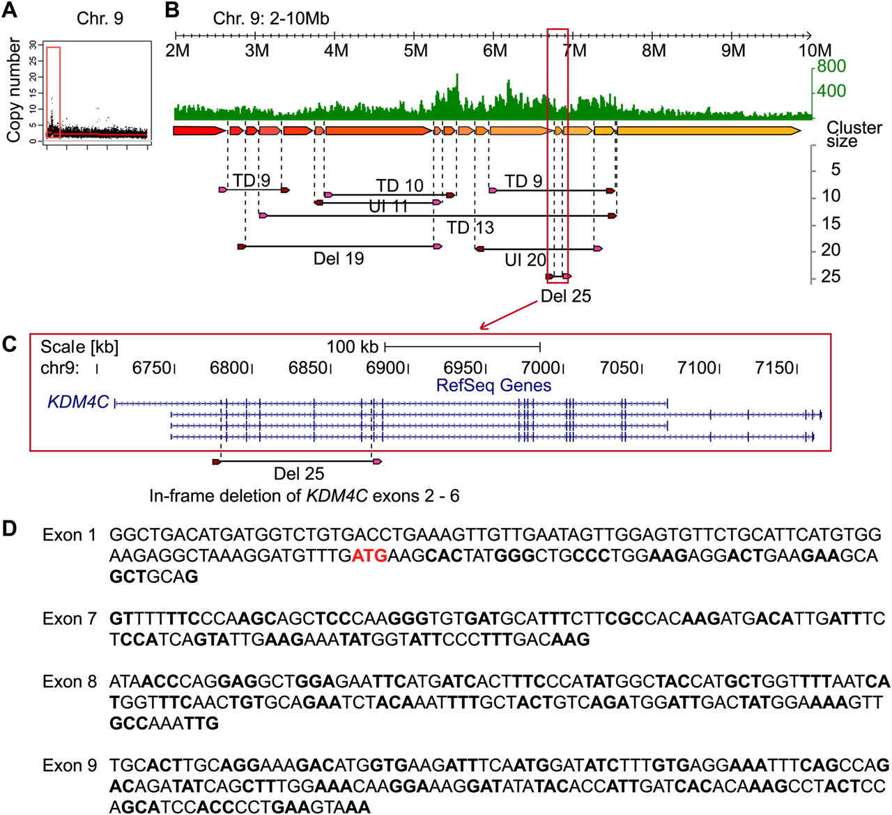 The architecture of an amplification in primary breast tumor 14. (A) Concordant tag based copy-number estimate for chromosome 9 indicates an amplification of the distal region of 9p. (B) Concordant tag distribution of chromosome 9 position 2–10 Mb (top, green track). Genomic segments between predicted breakpoints are indicated by colored arrows (middle) and dPET clusters with cluster sizes greater than eight are represented by horizontal lines flanked by dark red and pink arrows (bottom). Abbreviations for mapping characteristics of dPET clusters are described in Figure 4. (C) Genomic structure of KDM4C. Location of amplified deletion (Del25) is indicated by dashed vertical lines. (D) Sequencing result of RT–PCR confirms the in-frame deletion transcript with the more upstream located exon 1.