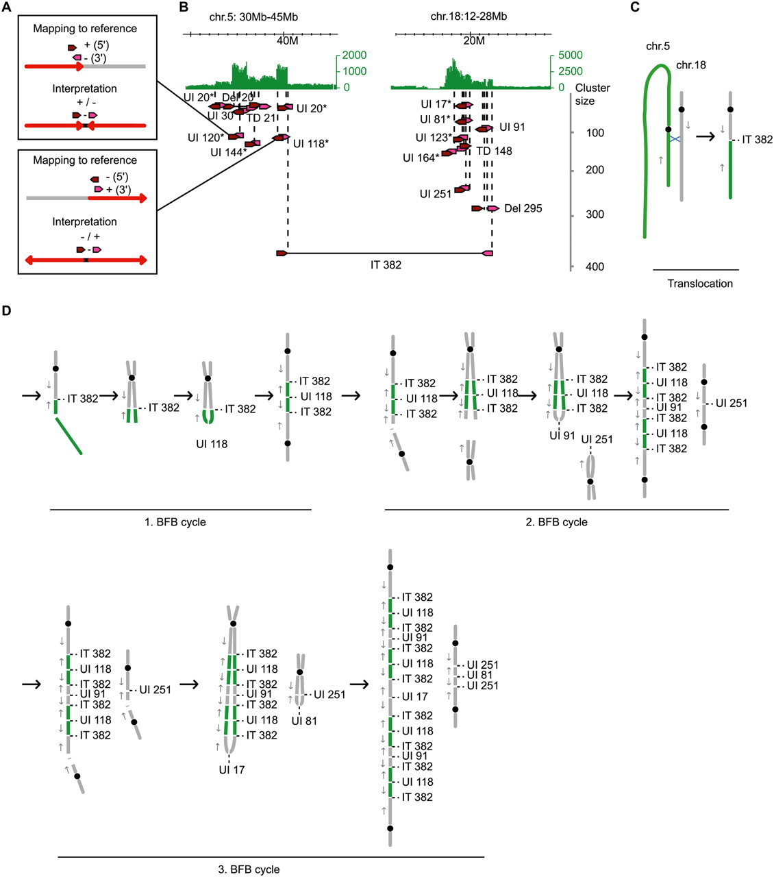 Accumulation of short-span unpaired inversions in amplified regions of gastric tumor 17. (A) PET mapping pattern of short-span unpaired inversions and the interpretation. The mapping of a 5′ anchor (dark red arrow) to the + strand and a 3′ anchor (pink arrow) to the – strand indicates a head-to-head fusion (red arrows) with increasing chromosomal coordinates closer to the breakpoint (top) and a 5′ – strand/3′ + strand mapping indicates a tail-to-tail fusion with decreasing chromosomal coordinates closer to the breakpoint (bottom). UI120 and UI118 in B are examples of head-to-head and tail-to-tail fusions, respectively. (B) Amplifications on chromosomes 5 and 18 of gastric tumor 17 are indicated by concordant tag counts (green). Cancer structural rearrangements with dPET cluster sizes >15 are indicated by dark red and pink arrows for 5′ and 3′ anchors, respectively. Abbreviations and figure structure are described in the legend of Figure 4B. Unpaired inversions with a breakpoint distance <40 Kb are indicated by asterisks. (C) Schematic representation of an isolated translocation between chromosome 5 (green) and 18 (gray). Black circles represent centromeres; blue X represents site of recombination; gray arrows indicate the direction of increasing genomic coordinates. (D) Interpretation of accumulated short unpaired inversions in amplifications by BFB cycles.