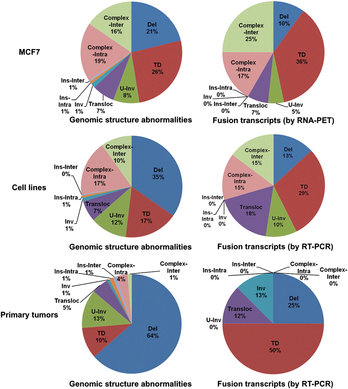 Different structure variation types seen in all genomic structure abnormalities and in only those giving rise to fusion transcripts in breast cancer genomes. Fusion transcripts detected by RNA-PET and validated by RT-PCR (top). Fusion transcripts (FGR + 3′T-ER) identified through the RT-PCR screening in three cell lines (middle) and five primary tumors (bottom). (Del) Deletion; (TD) tandem duplication; (U-Inv) unpaired-inversion; (Transloc) isolated translocation; (Inv) inversion; (Ins-Intra) intrachromosomal insertion; (Ins-Inter) interchromosomal insertion; (Complex-Intra and Complex-Inter) intra- and interchromosomal connections in hot spot of genome breakpoints (super cluster size ≥3) (Hillmer et al. 2011).
