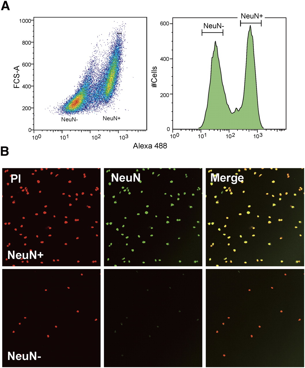 Separation of neuronal and non-neuronal nuclei by FACS. (A) Typical example of the nuclei sorting based on Alexa Fluoro 488-conjugated anti-NeuN antibody. (B) Microscopic examination of isolated neuronal (NeuN+) and non-neuronal (NeuN−) nuclei. Note that the image did not reflect the yield because of the different levels of dilution.