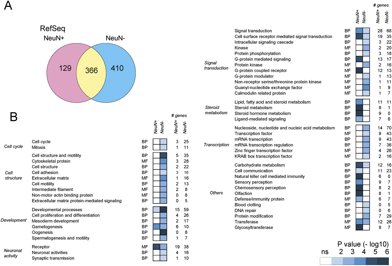 Ontology and expression analysis of the genes associated with DNA methylation. (A) Venn diagrams of the RefSeq genes associated with MRs. Supplemental Tables 7–9 list the genes. (B) PANTHER ontology analysis of the genes associated with neuronal and non-neuronal MRs. The ontology terms are arbitrarily grouped based on their functions. (ns) Not significant; (BP) biologic process; (MF) molecular function.
