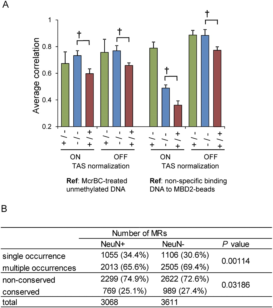 Variations in neuronal and non-neuronal methylation. (A) Average correlation of pairwise comparisons of signal intensities of all probes on the tiling array. Green bars indicate the average correlation coefficient between NeuN+ and NeuN− samples from the same subject (n = three pairs). Blue and red bars indicate the average correlation coefficient between NeuN− samples (n = six combinations) and between NeuN+ samples (n = six combinations), respectively. The dagger indicates P < 0.05 by the Student's t-test. Values are mean ± SD. (B) Interindividual variations of the location of neuronal and non-neuronal MRs. Number of MRs detected in various conditions are shown. Single occurrence: MRs found in only one subject. Multiple occurrences: MRs shared by two or all subjects. Nonconserved: MRs in one subject or shared by two subjects. Conserved: MRs shared by all subjects. P-values are determined by the Fisher exact test. Note that the number of shared MRs in three subjects differed from that represented in the text because of the exclusion of common MRs from every individual MR for this analysis (Supplemental Fig. 3).